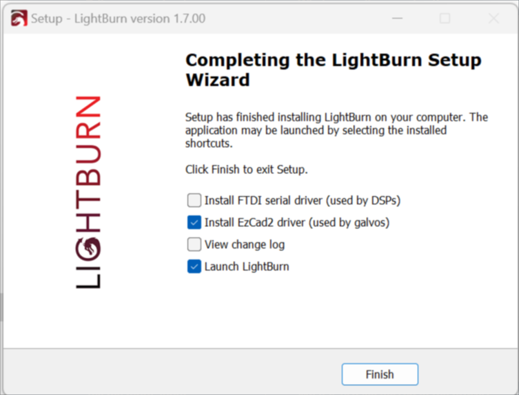 When you install Lightburn, you need to make sure you install the Galvo driver at the End of the Lightburn install. Be sure to check the box and go through the setup. If you miss this step, you can run back through the Lightburn installer again and check the box. If you accidentally installed the EzCad2 driver from the included USB stick, you will need to uninstall it to be able to swap to the Lightburn Driver. Please see this video on how to do that. |