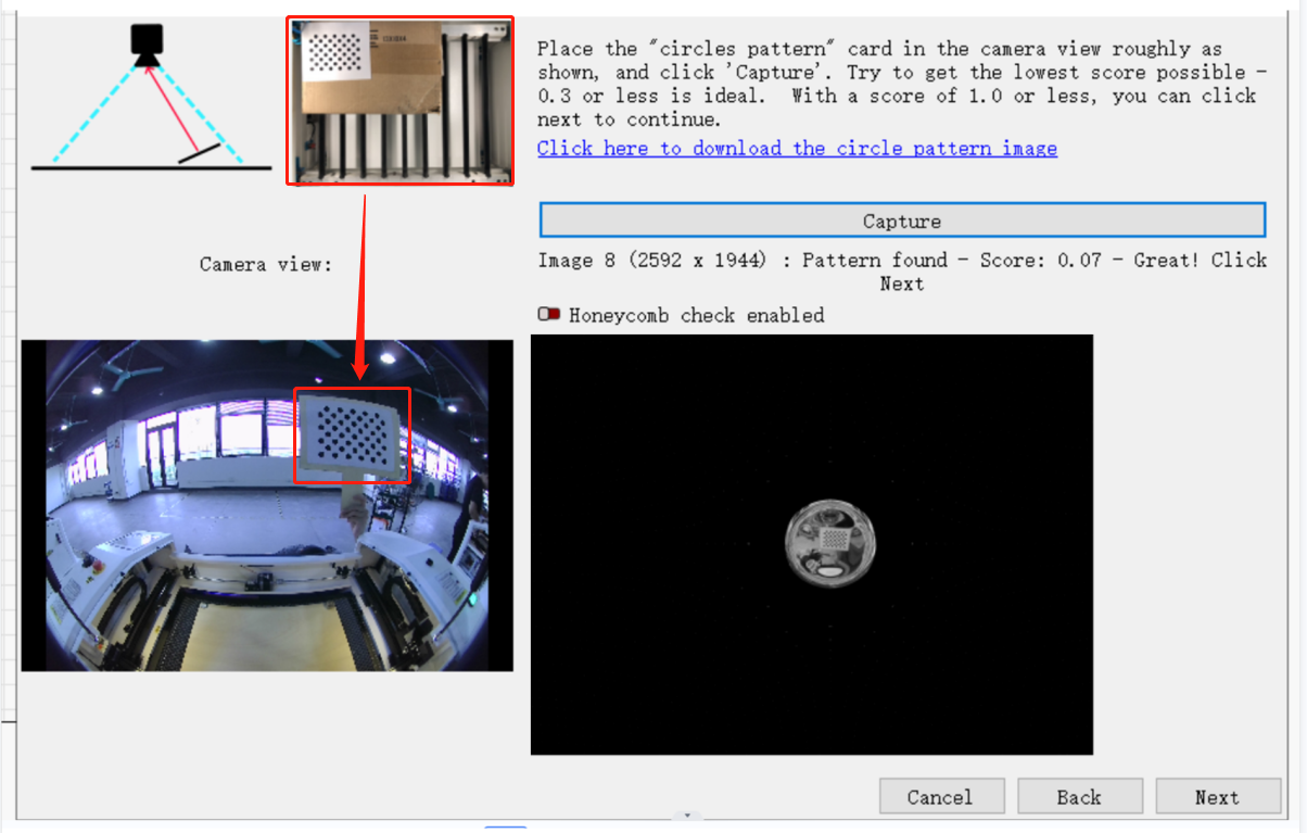 14. ① Follow the prompts to place the circle pattern image in the corresponding position of the real-time captured screen; ② Uncheck Honecomb check enabled; ③ Capture; ④ Check that the score is less than or equal to 1.0 and the calibration inspection file in the capture picture is clear; ⑤ Next;
