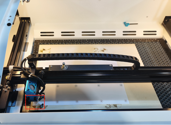 2. Put the plywood on the platform and fasten the plywood with magnets. Make sure the plywood is level and the magnets do not exceed 4mm. Please refer to this picture for the position of the board and the laser head.