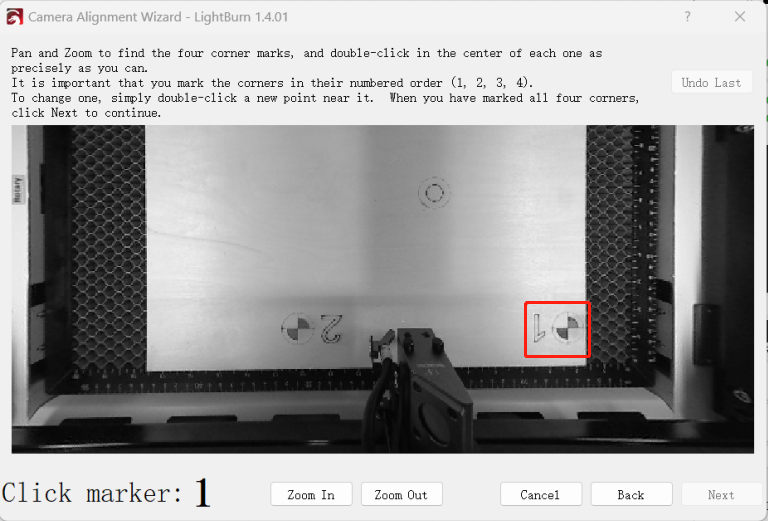 20.Zoom in the circle corresponding to the code according to Lightburn's prompt, and click on the center of the circle to mark it.