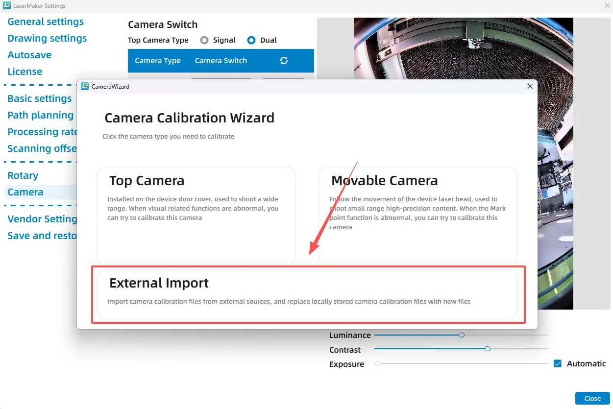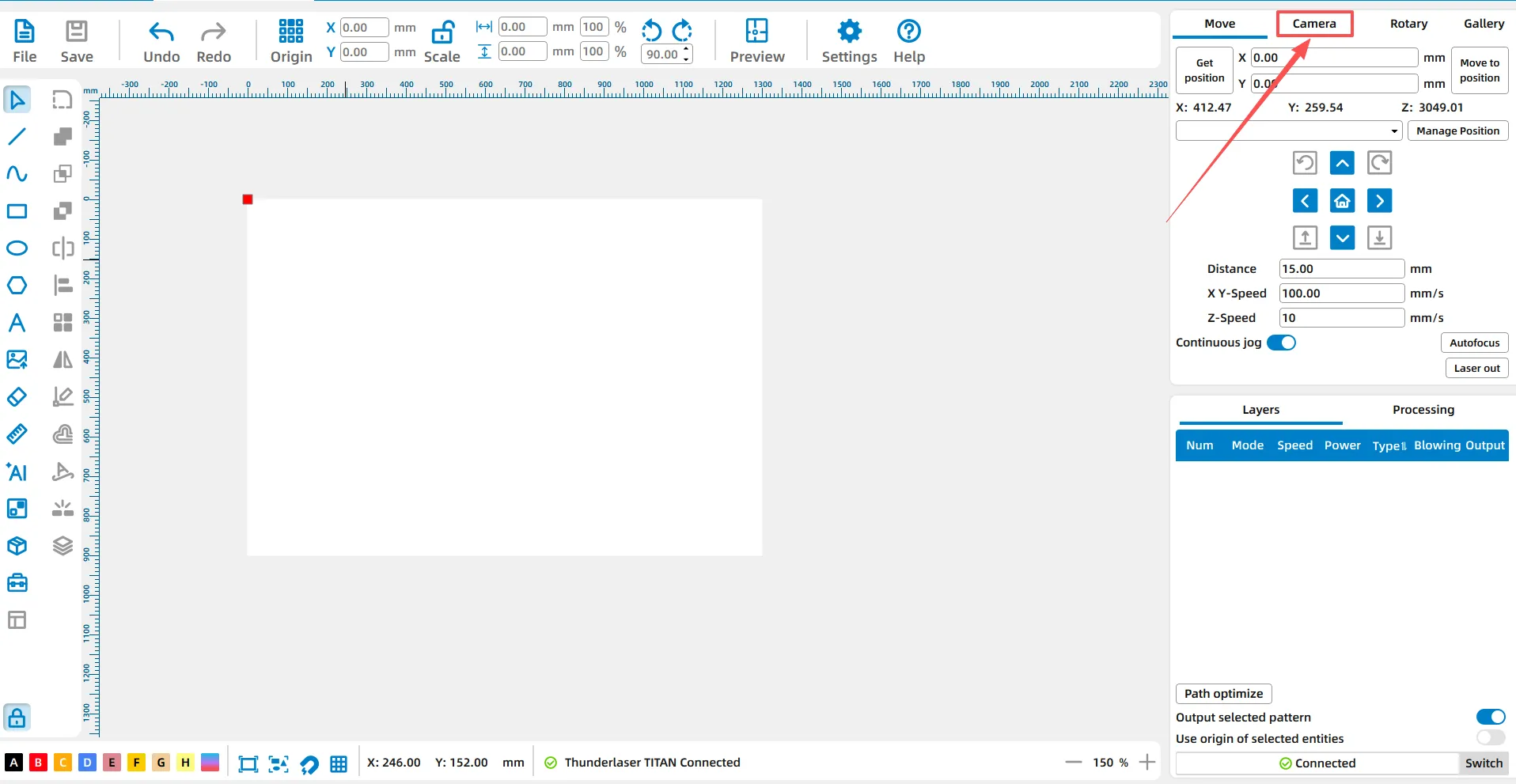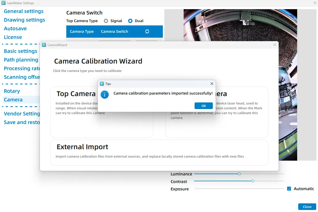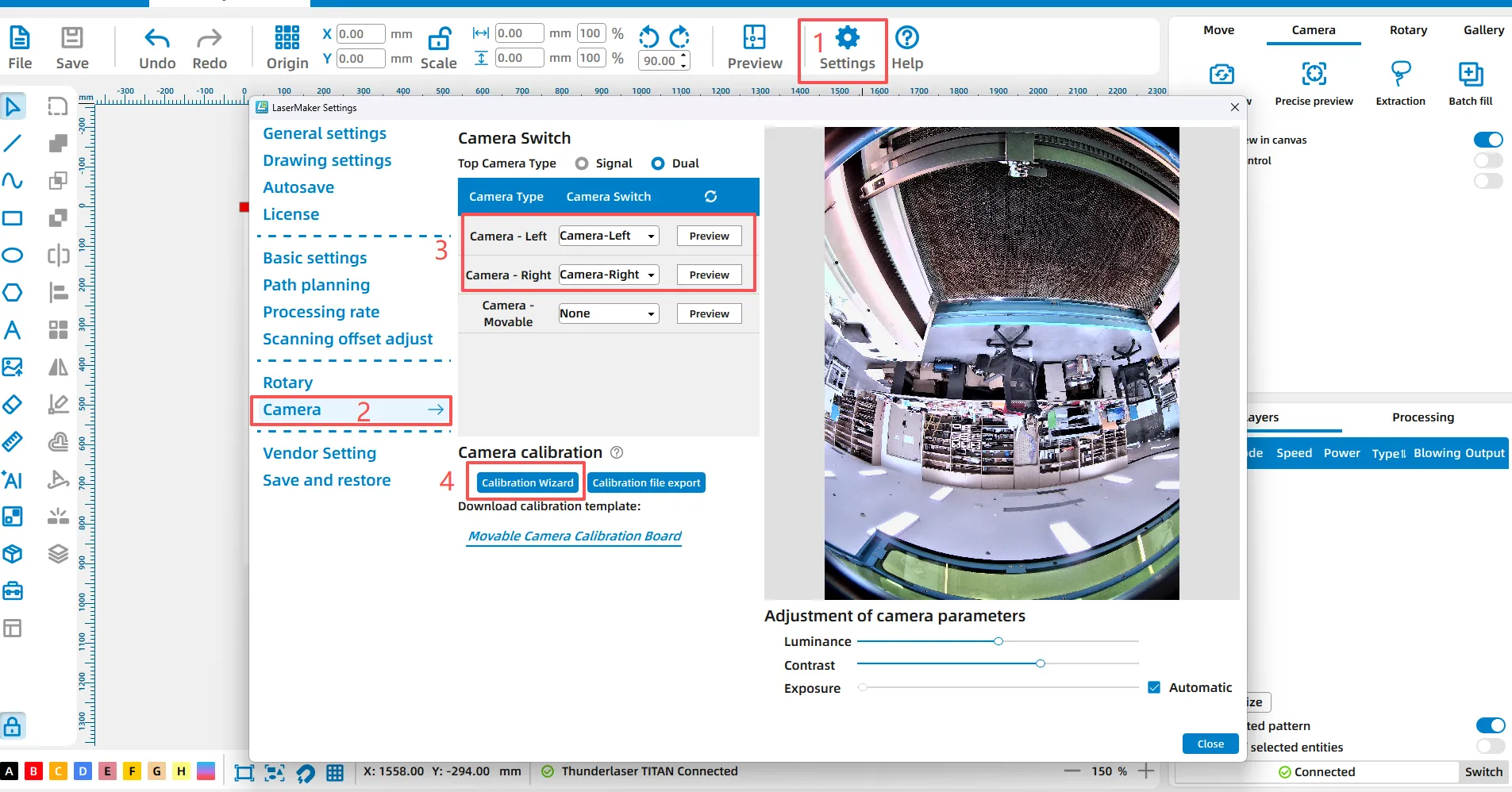 Every machine in the TITAN series has a camera or dual camera, as well as a calibration file. Import the calibration file directly to use the camera.