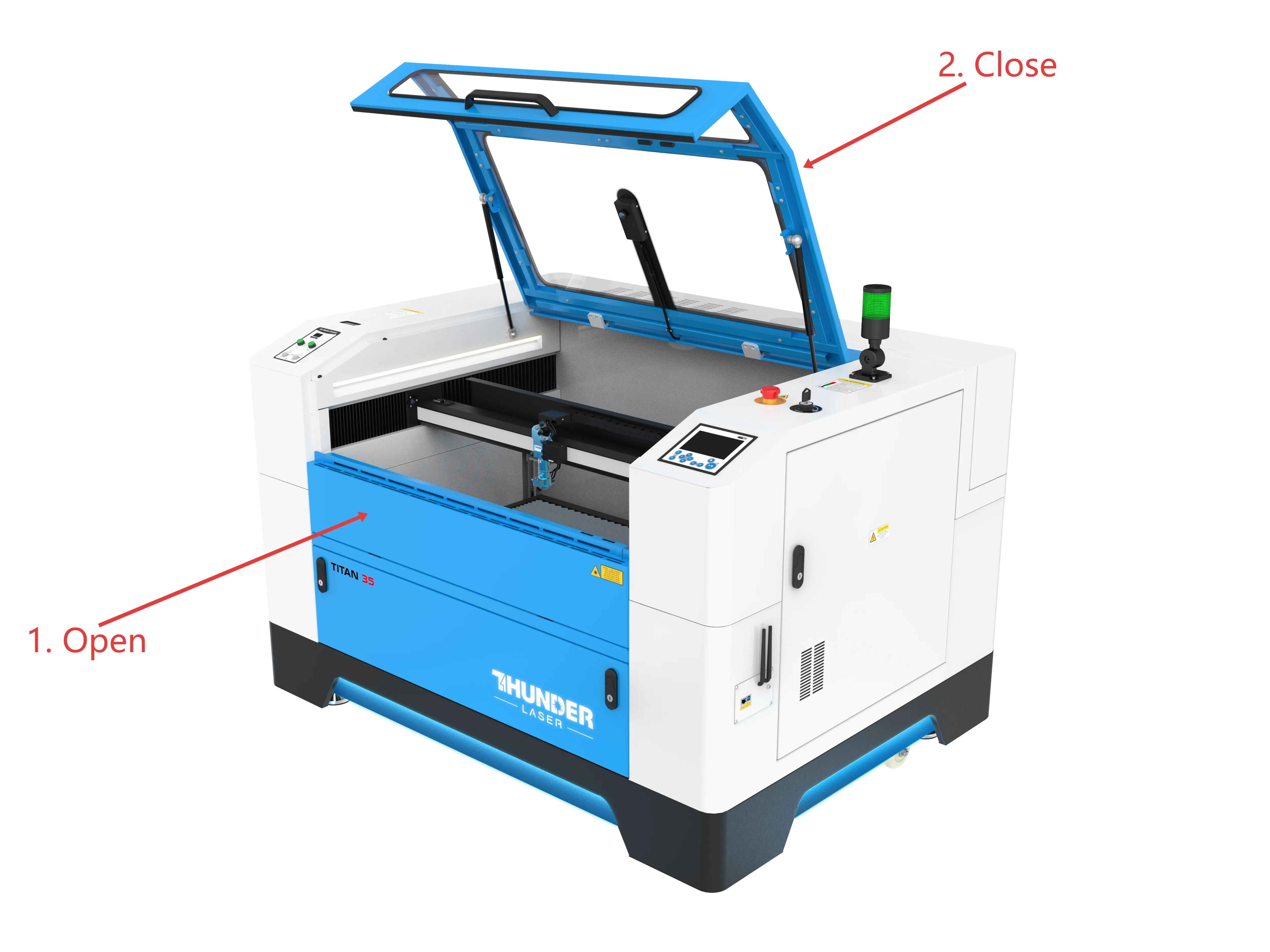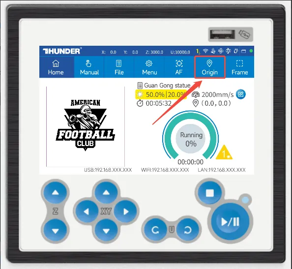 - Once the laser head is positioned as shown in the image above, click the Origin button on the touch panel.