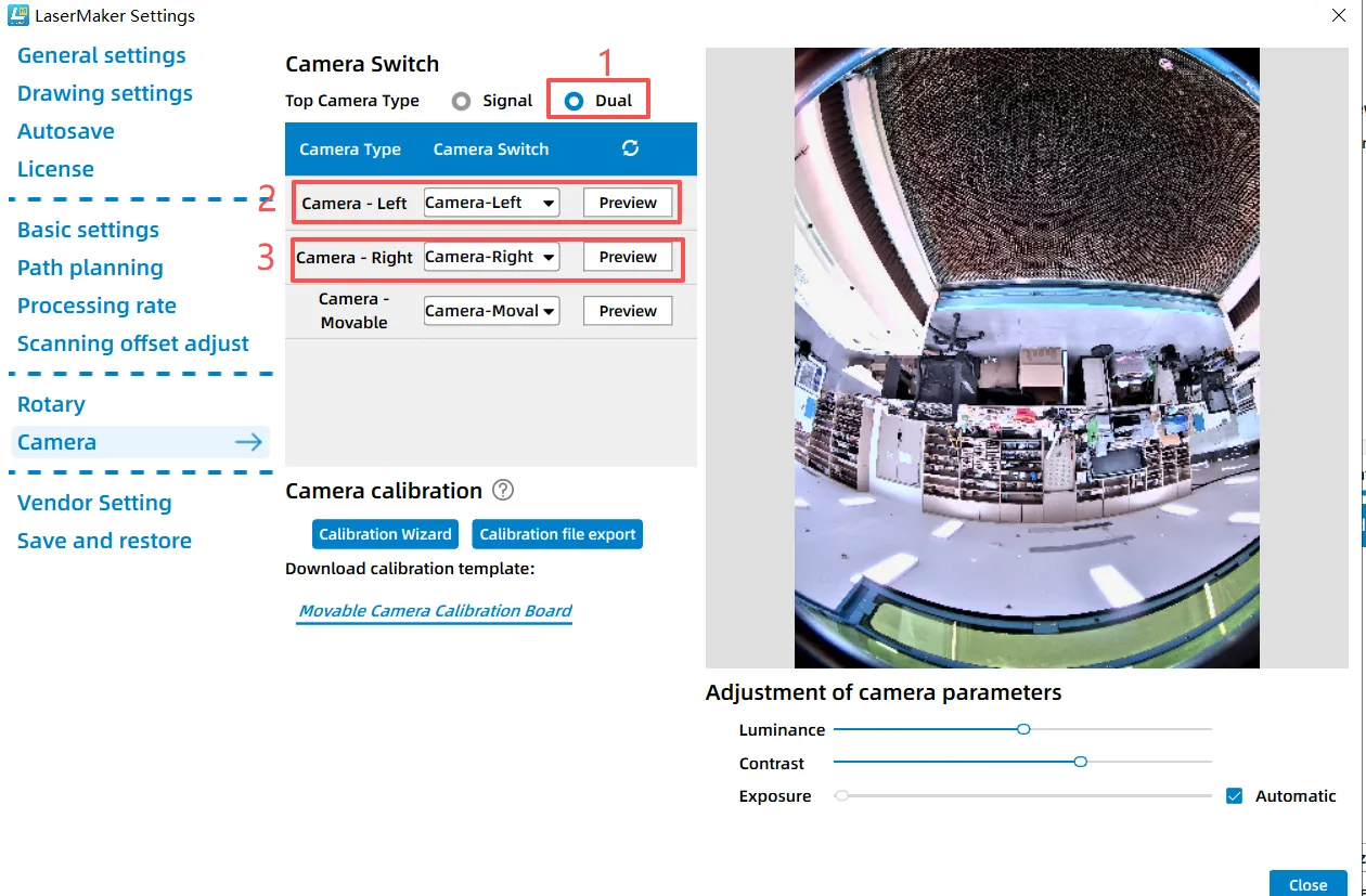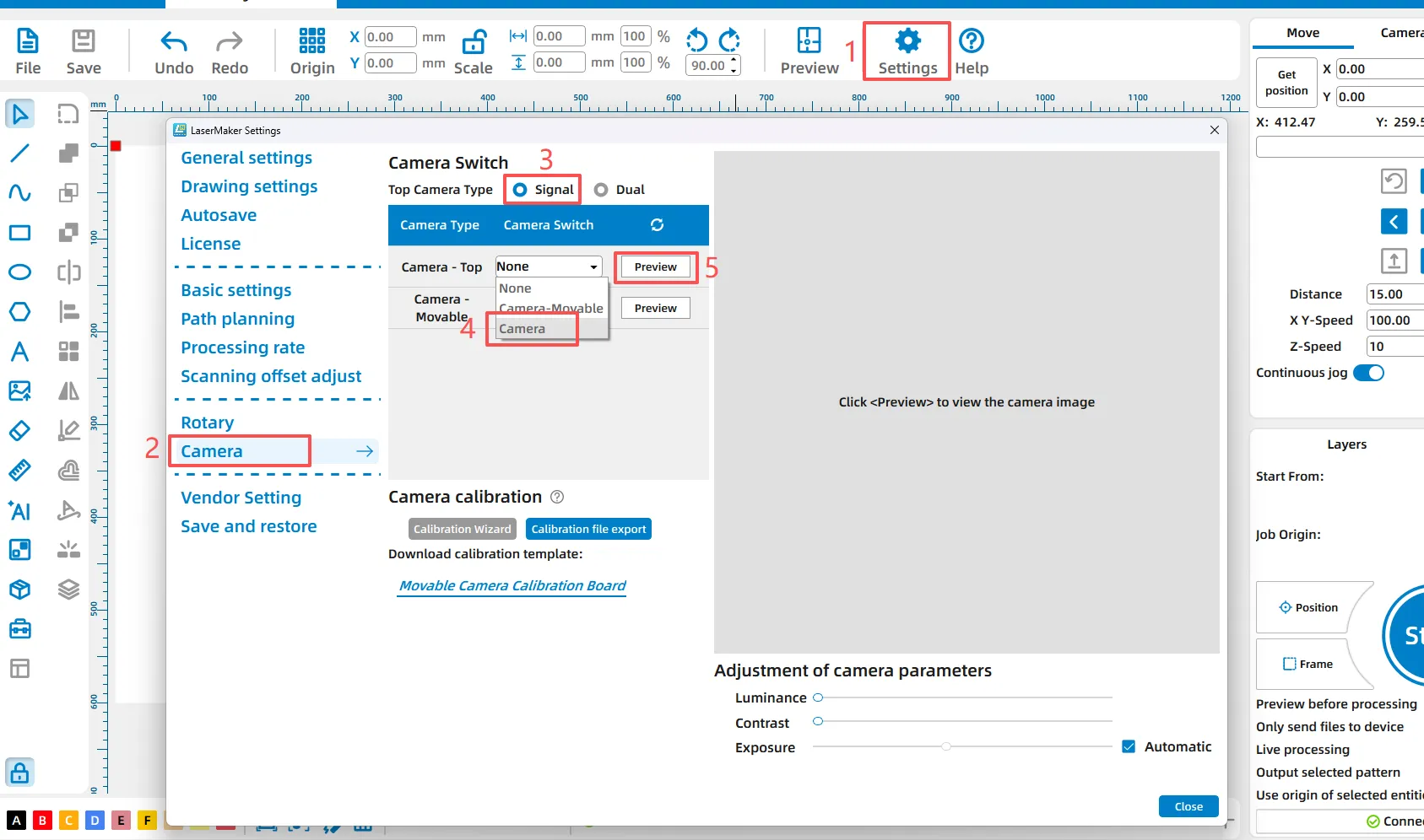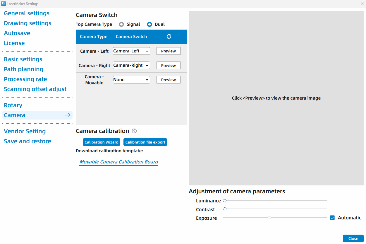 Please note that the following calibration process is for the new vision algorithm of LaserMaker2.3.1. If your machine’s calibration file was created with the old version of the software, it is not compatible with LaserMaker2.3.1, and you will need to recalibrate by following the steps below.
