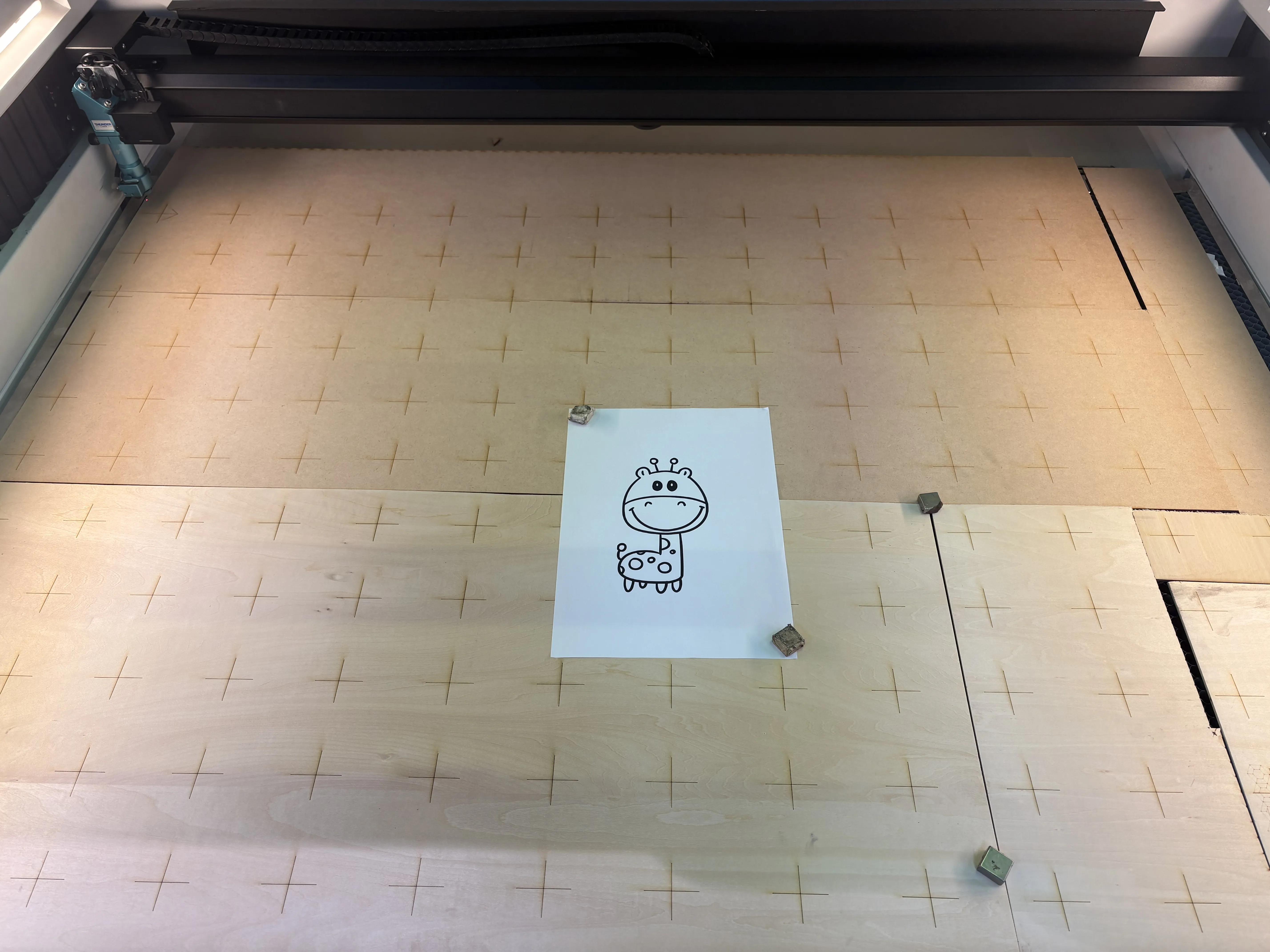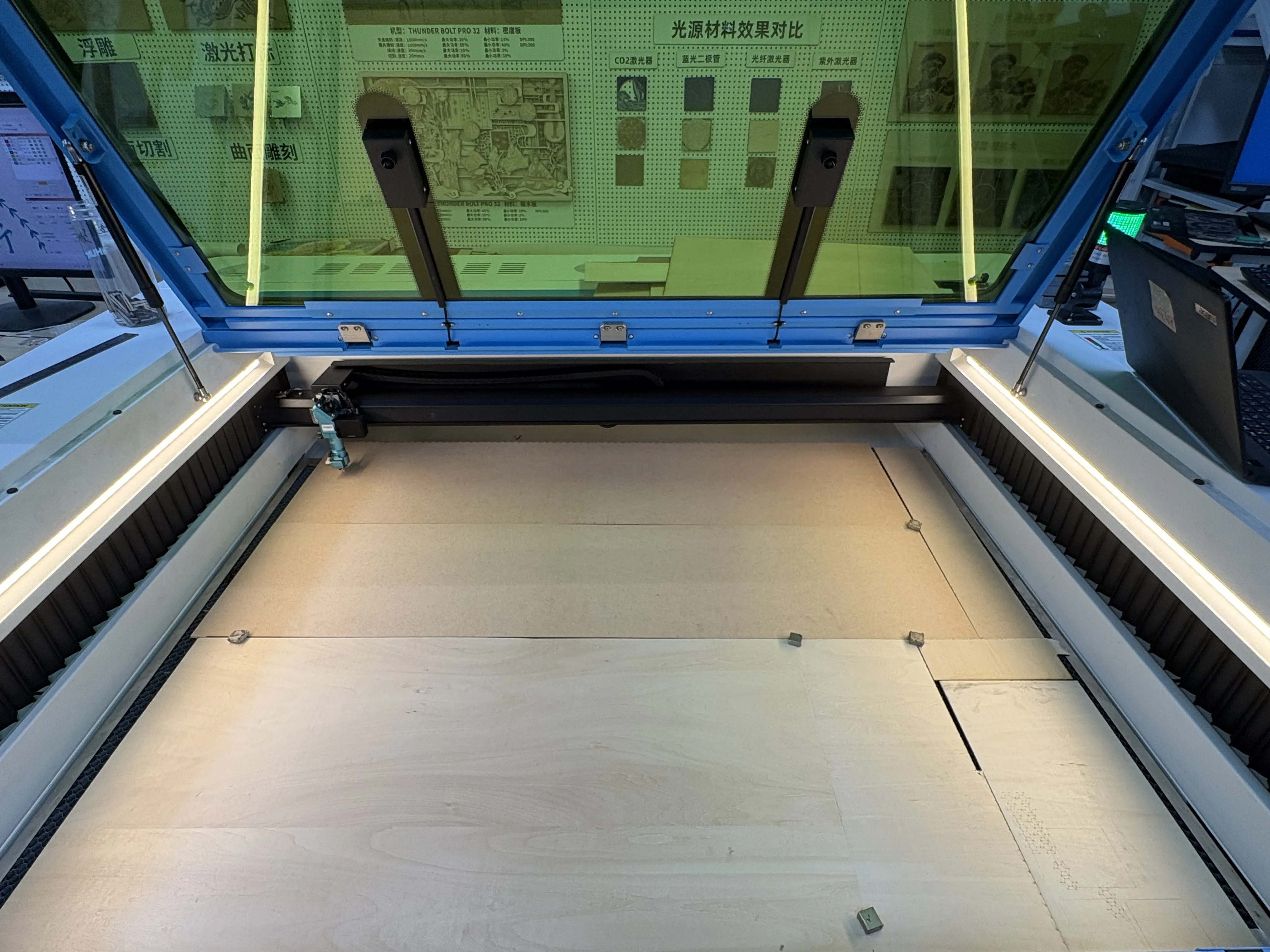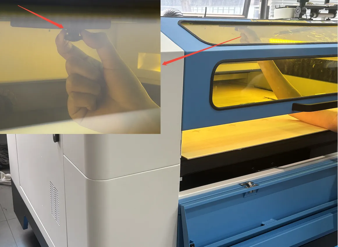 - Next, place the plywood on the platform and ensure it is flat and secure—you can use clamps, double-sided tape, or other suitable methods based on your actual equipment. Then, move the laser head to the machine’s zero position and refer to this picture for the correct placement of the plywood and laser head.