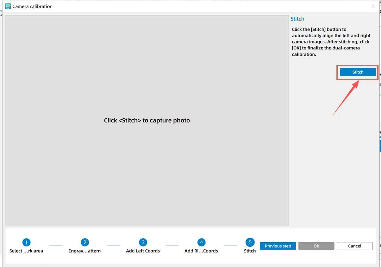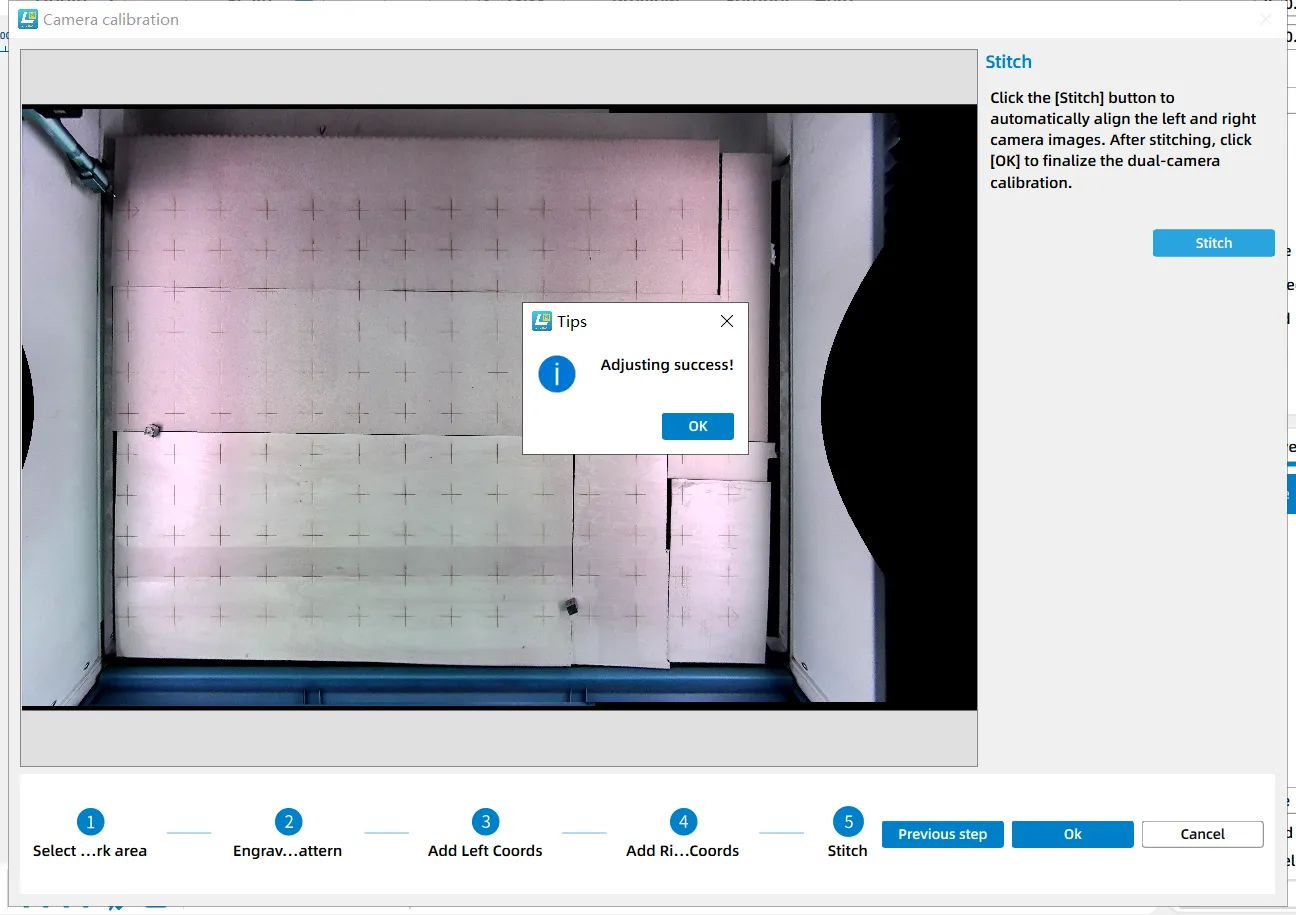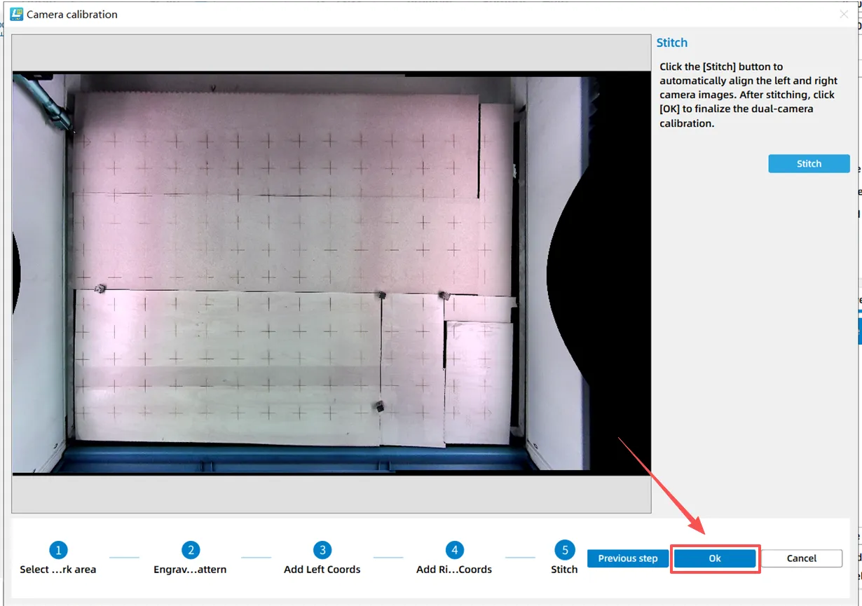18. Click the "Stitch" button to automatically align the left and right camera images, then click "OK" to finalize the dual-camera calibration.