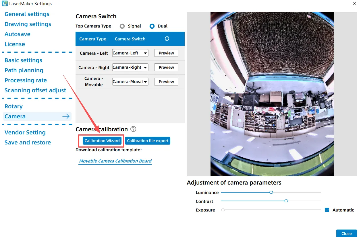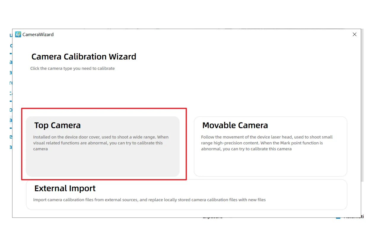 - After that, click the 'Calibration Wizard' button to start the camera calibration process. In the pop-up 'Camera Calibration Wizard' window, select 'Top Camera'.