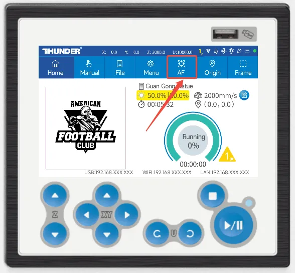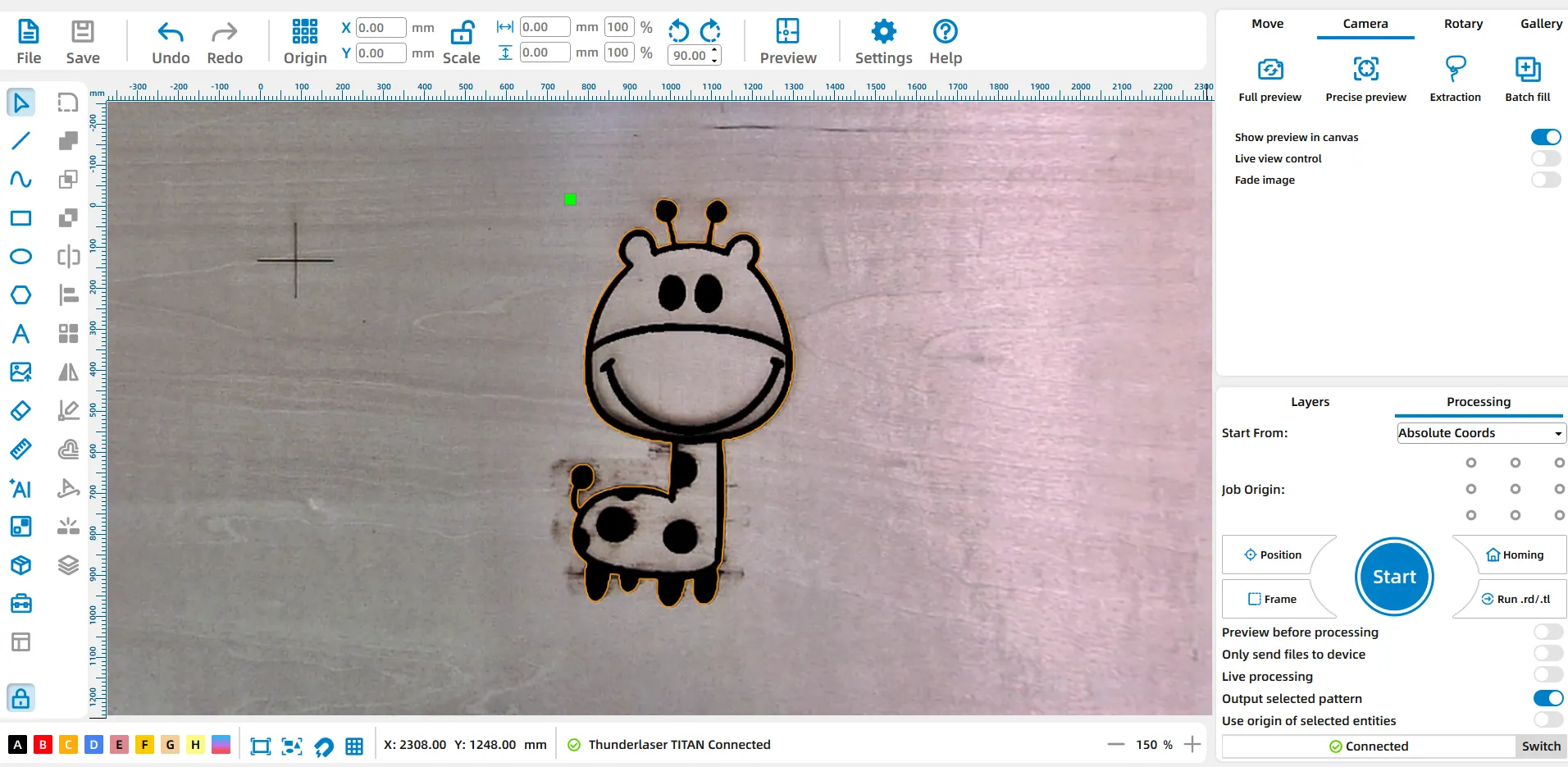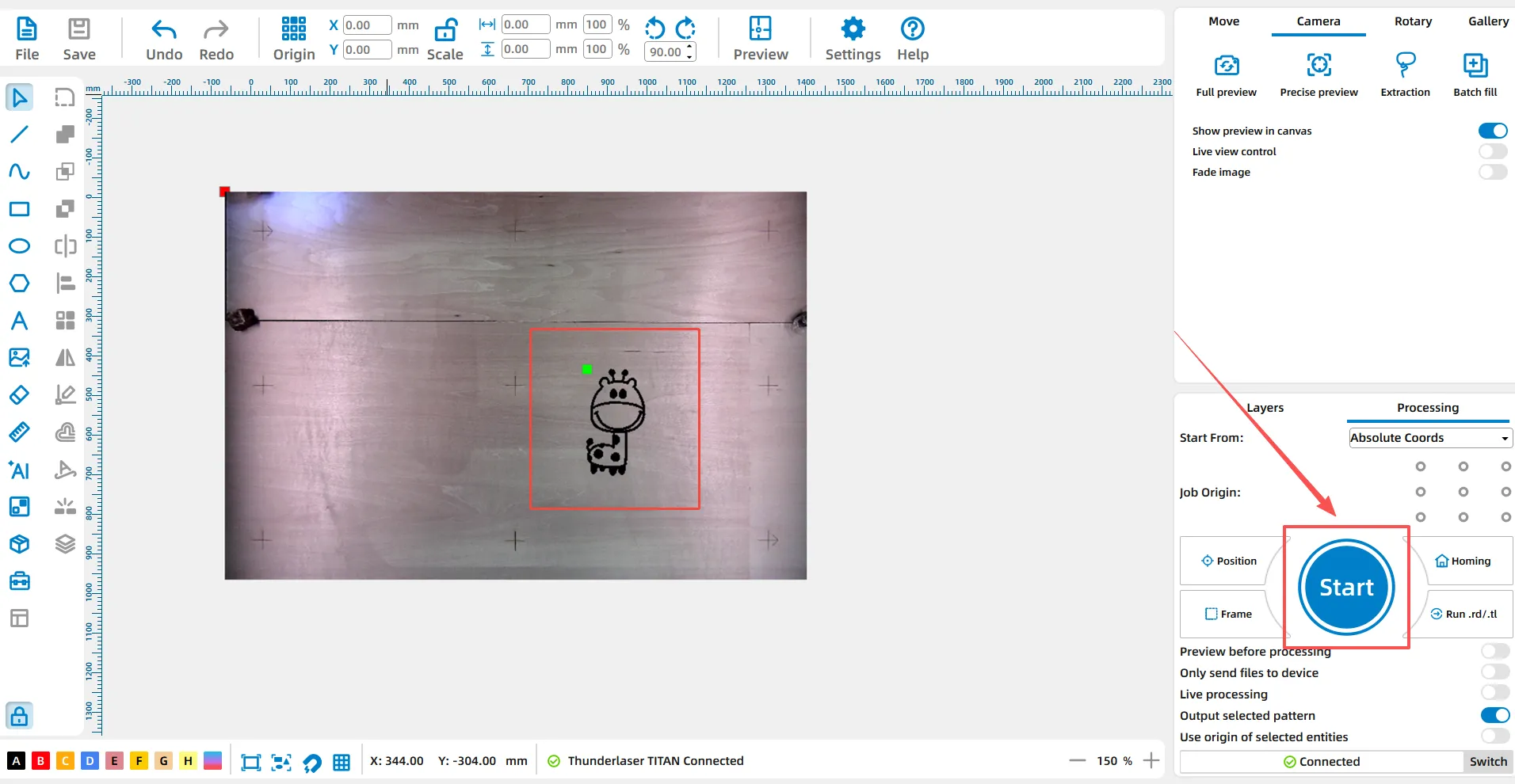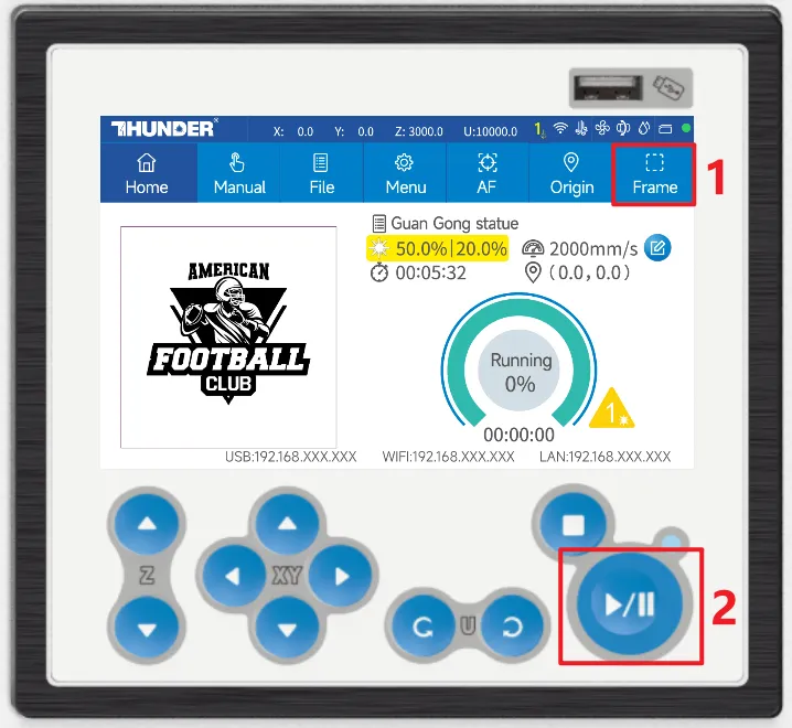 15. Then, click the "Frame" button on the machine to check that the border is within the working area and there's no collision risk. Then press the 'Start' button on the control panel to begin processing.