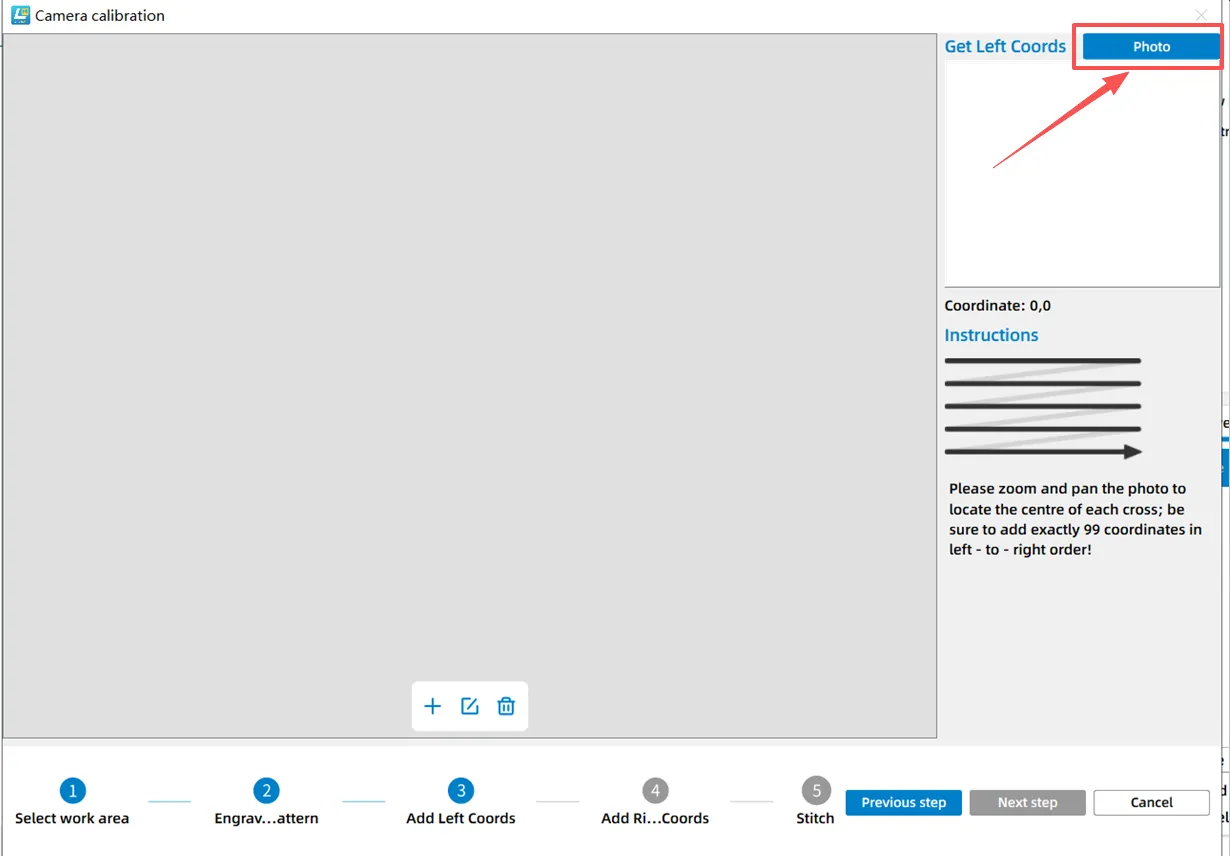 16. During processing, click the "Photo" button to capture the image of the left cross marks, then zoom and pan the photo to accurately locate the center of each cross.