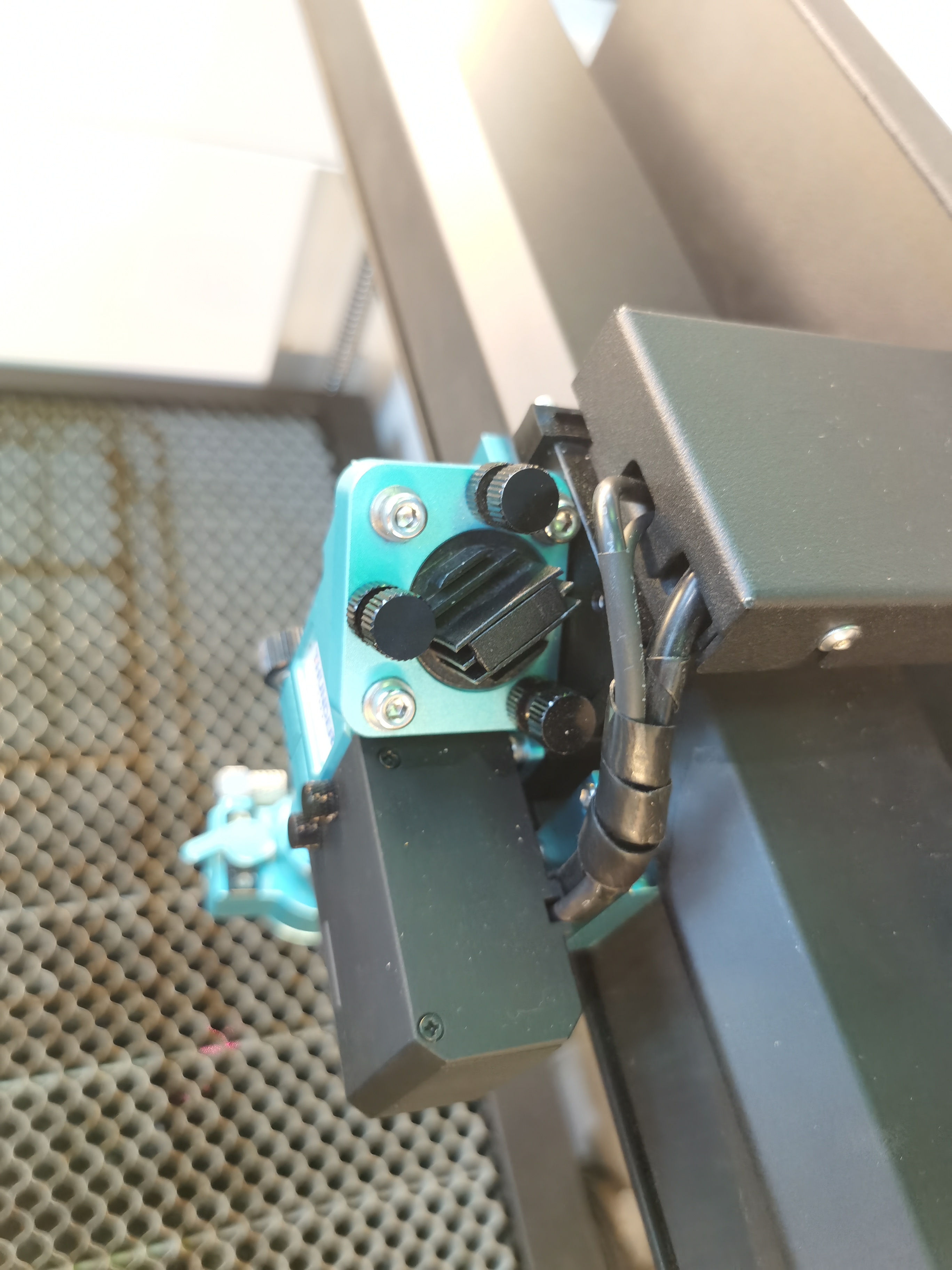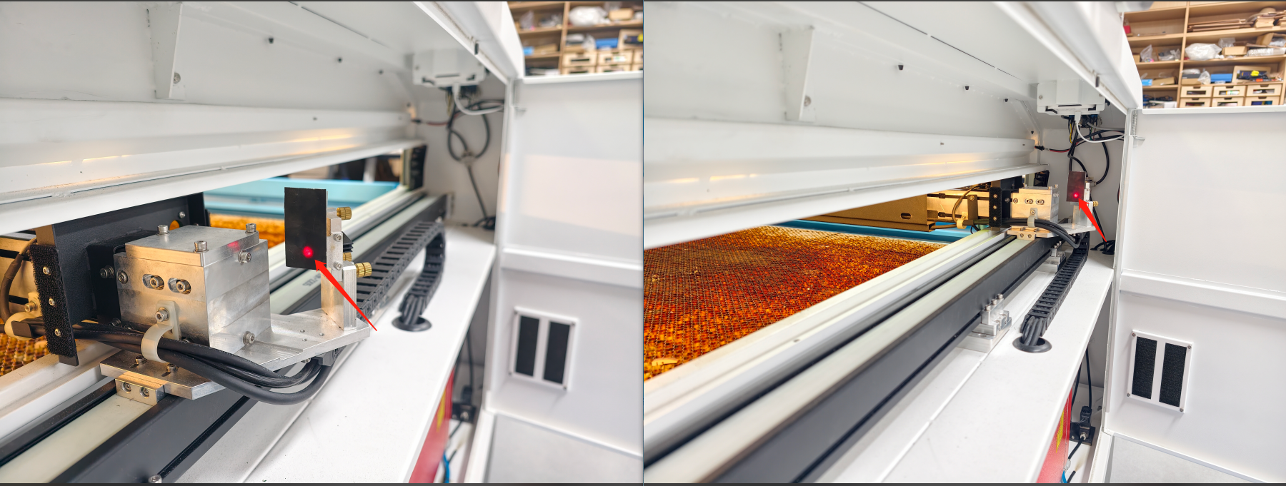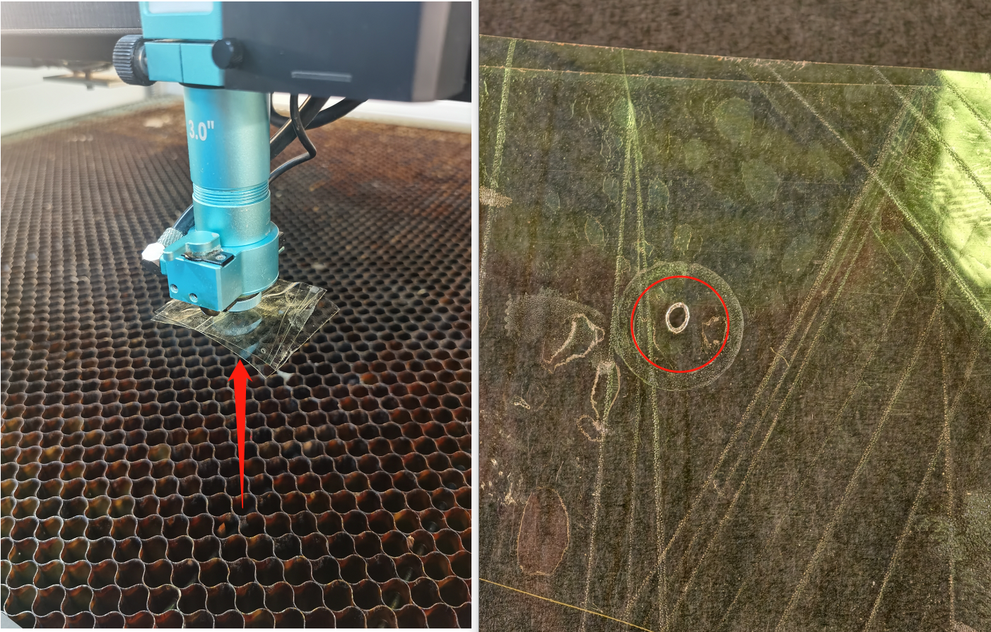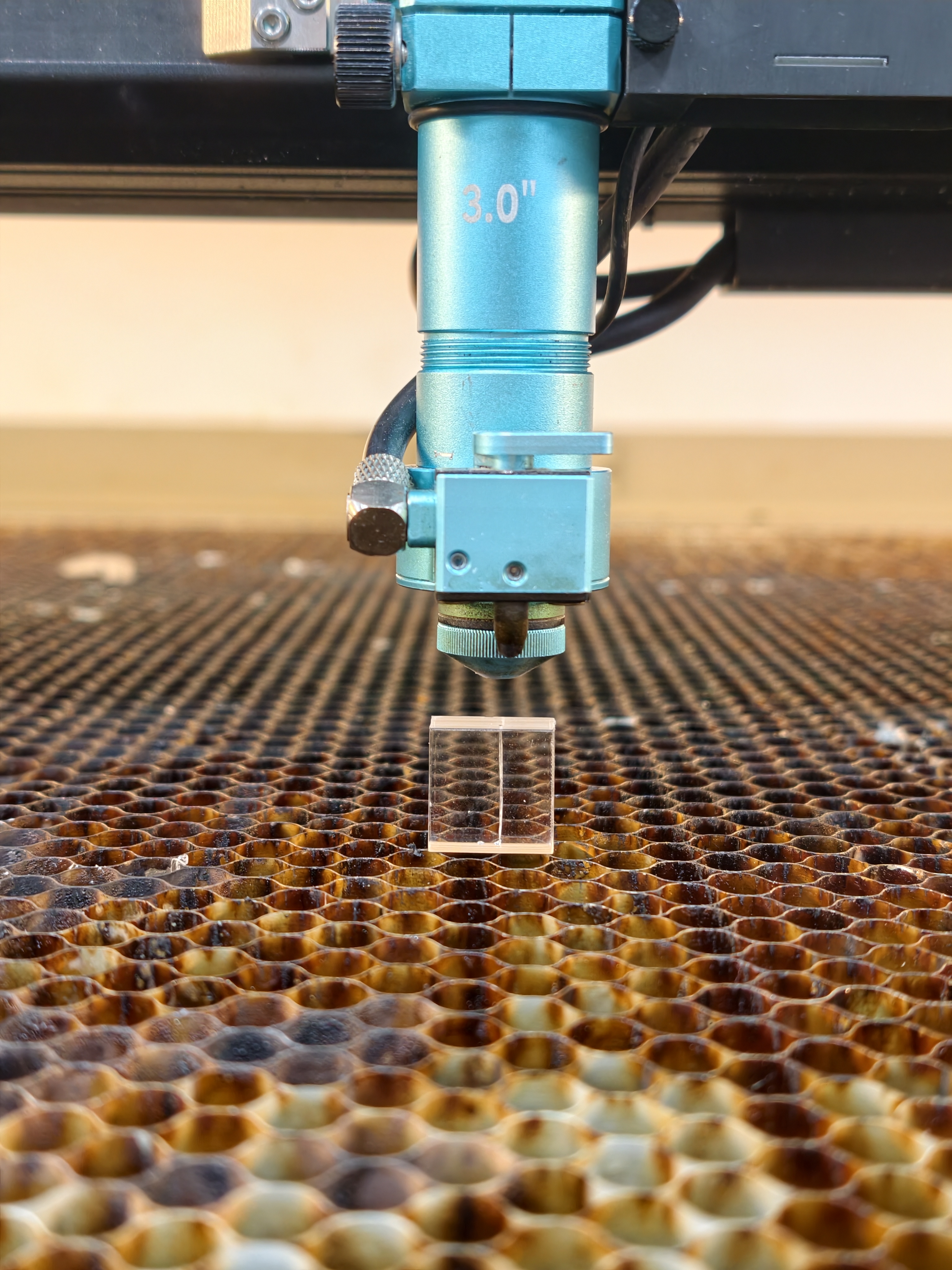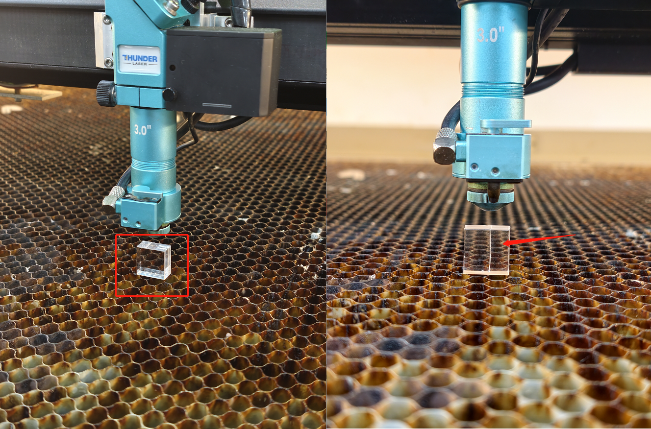 - Place the 20mm acrylic block on the honeycomb table, focus on its surface, then pulse the laser.