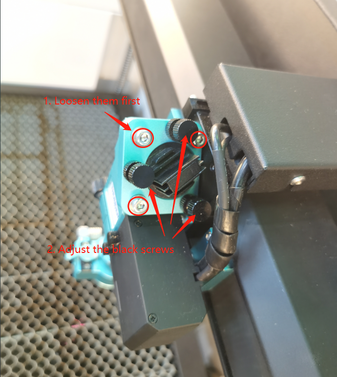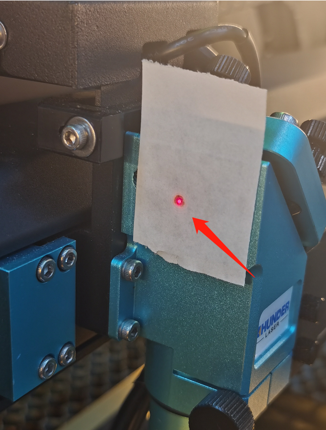 Adjust the Red Dot Pointer Holder bolts (rear of the machine) until the red dot and the burn mark overlap. |
