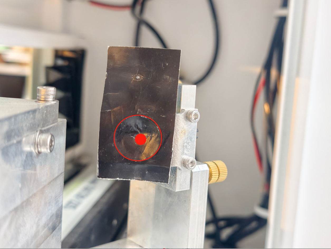 ⚠️WARNING: Do not modify the alignment of Mirror 2; if you do so, it will mess up the previous fiber laser beam alignment - Repeat Near/Far pulses until the marks coincide (the far burn mark falls at the same point as the near burn mark).
