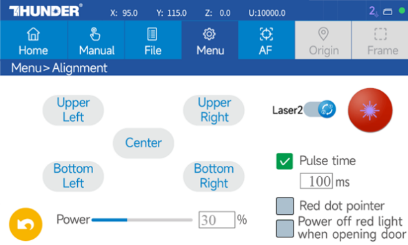 - Switch to Laser 1 (CO2). Set Power: 30%, Pulse Time: 100ms, Tick “Red dot pointer”.
