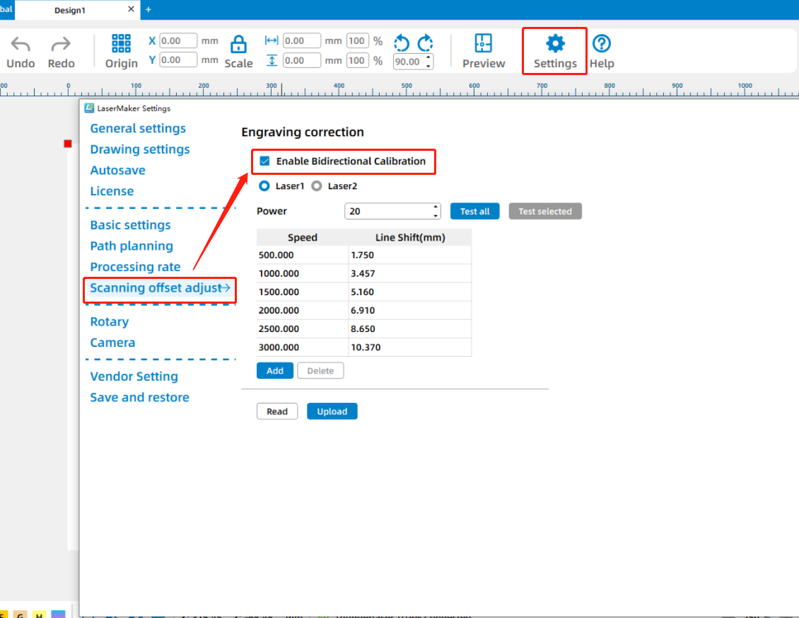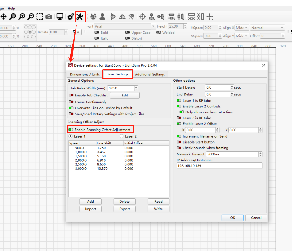 If no value is displayed under Engraving Correction, please click Read to let the software retrieve the data from the controller.Open the LightBurn, click the Device Setting→Basic Setting→Enable Scanning Offset Adjustment