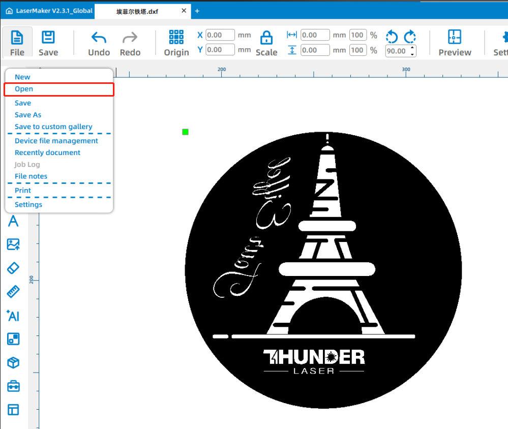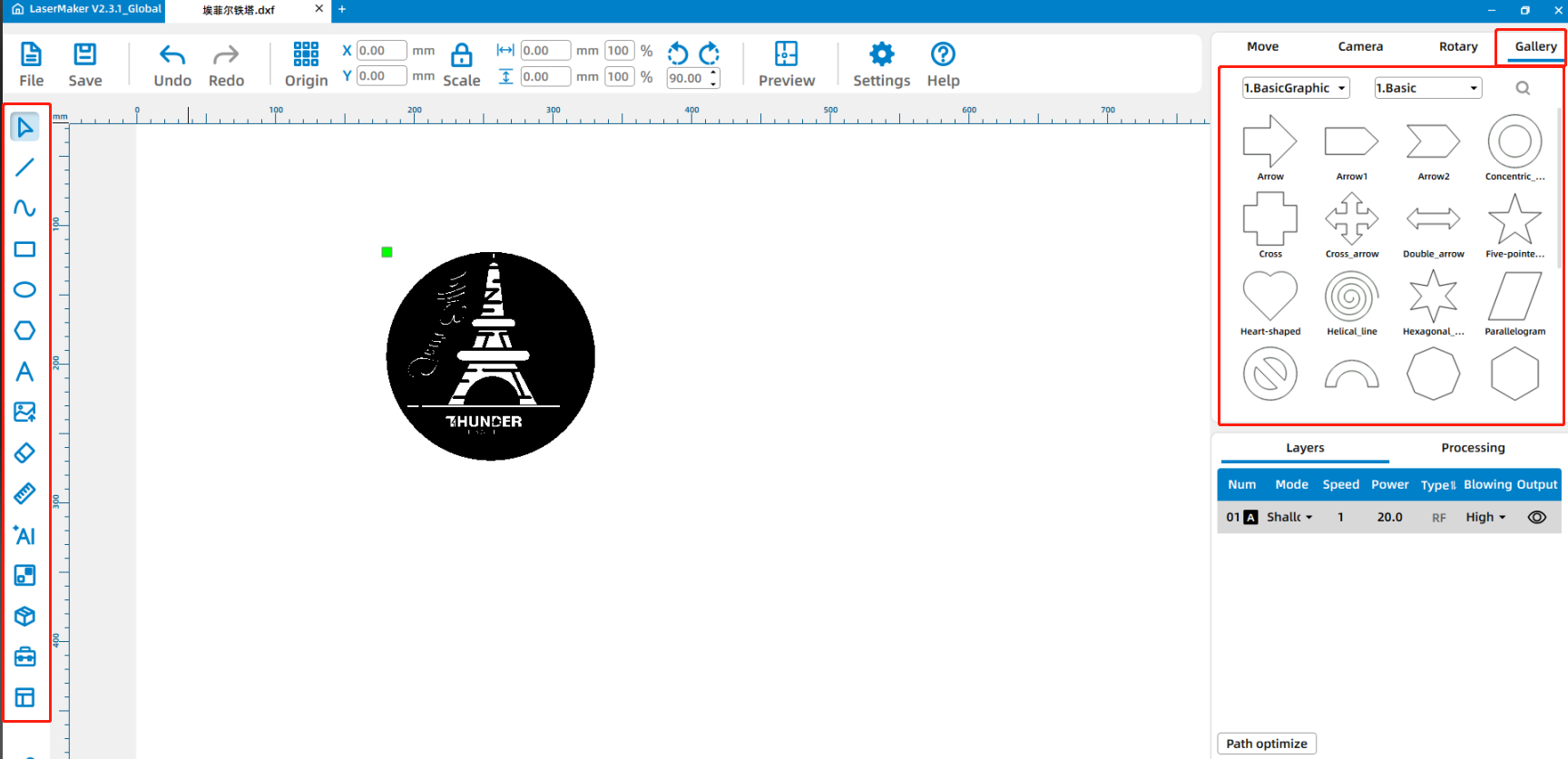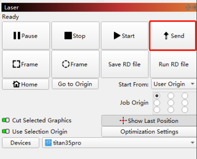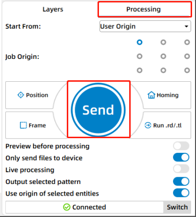 If no value is displayed under Scanning Offset Adjust, please click Read to let the software retrieve the data from the controller.Import your design or use the built-in toolbar to create one. Then, set the processing parameters and send the file to the machine.