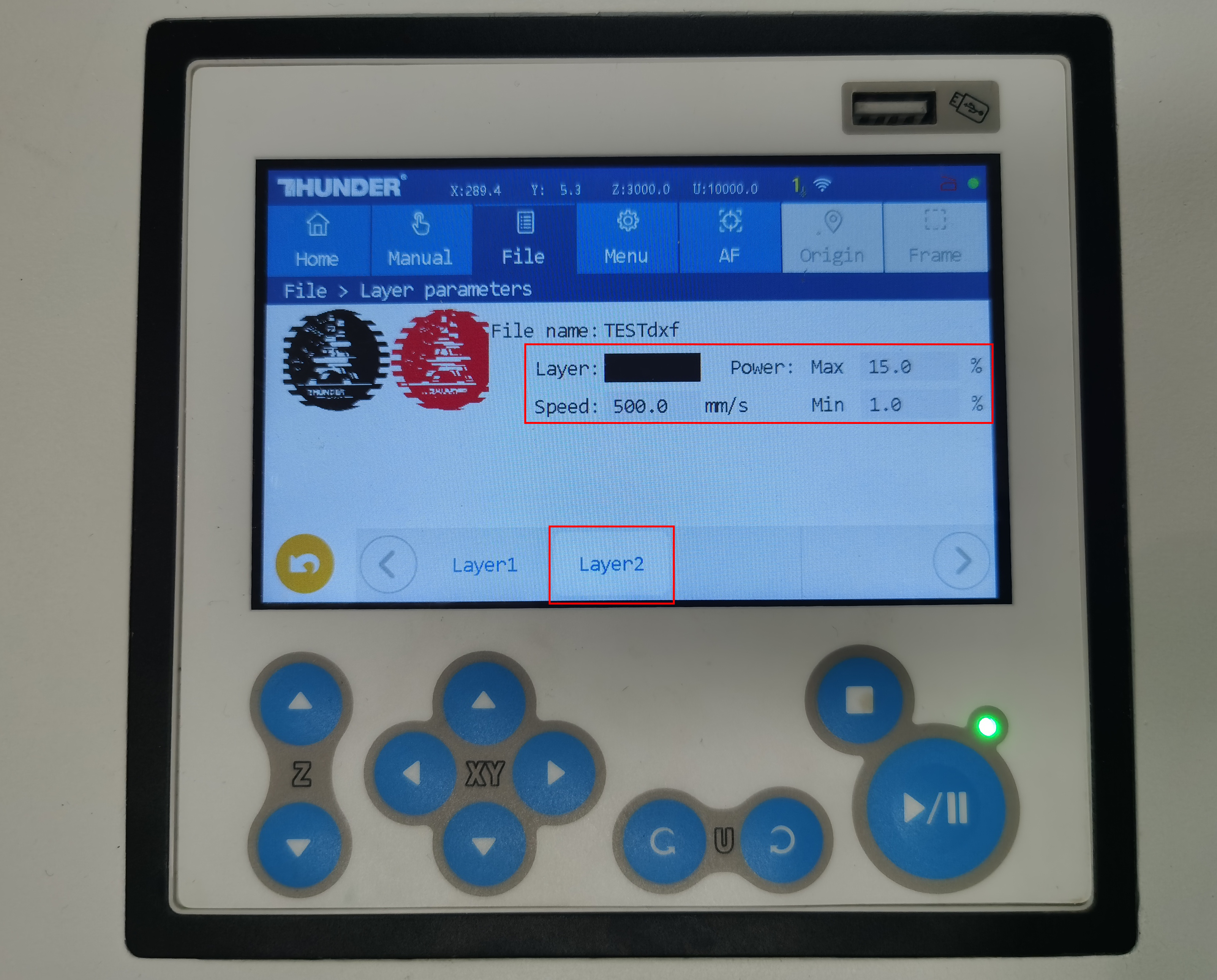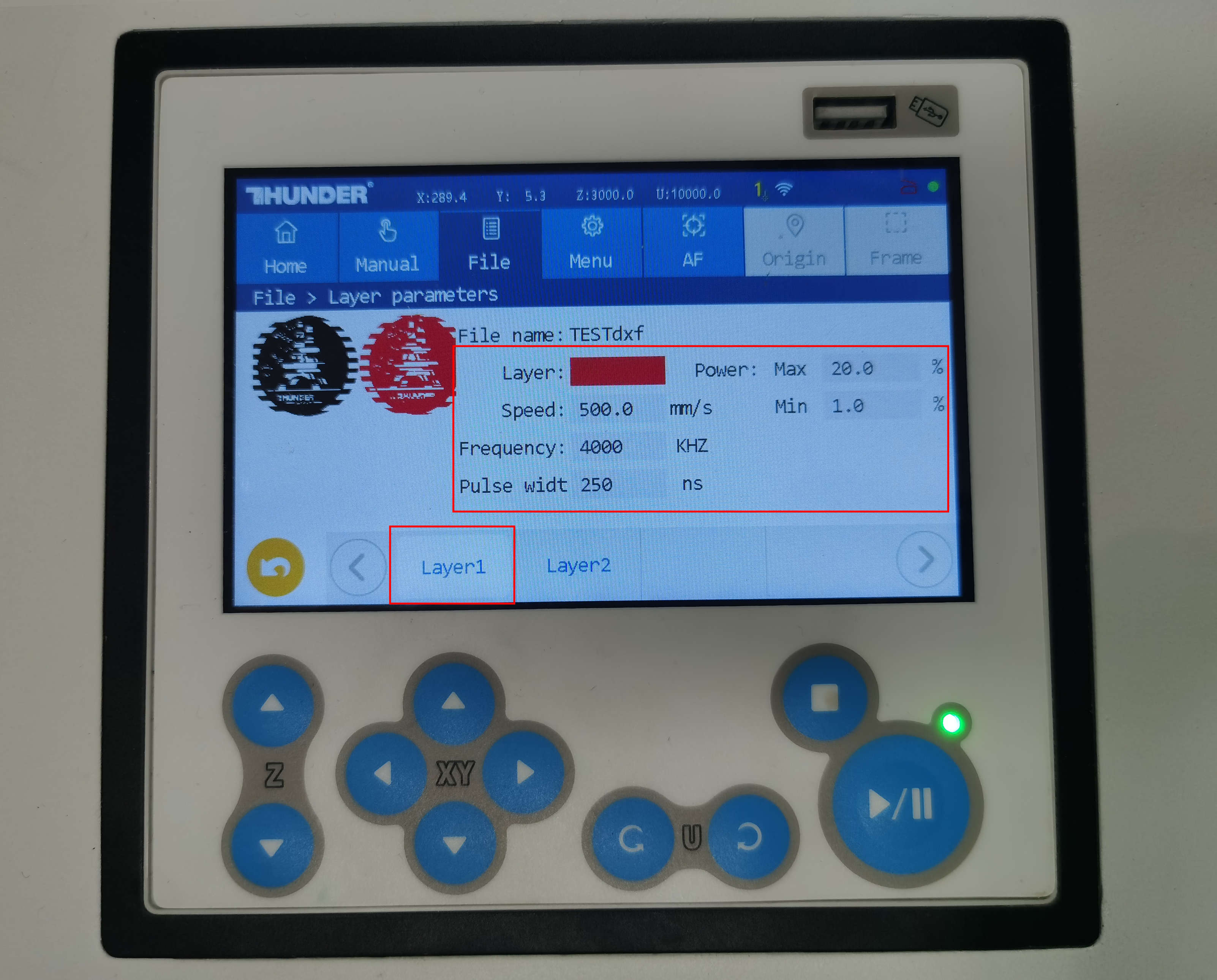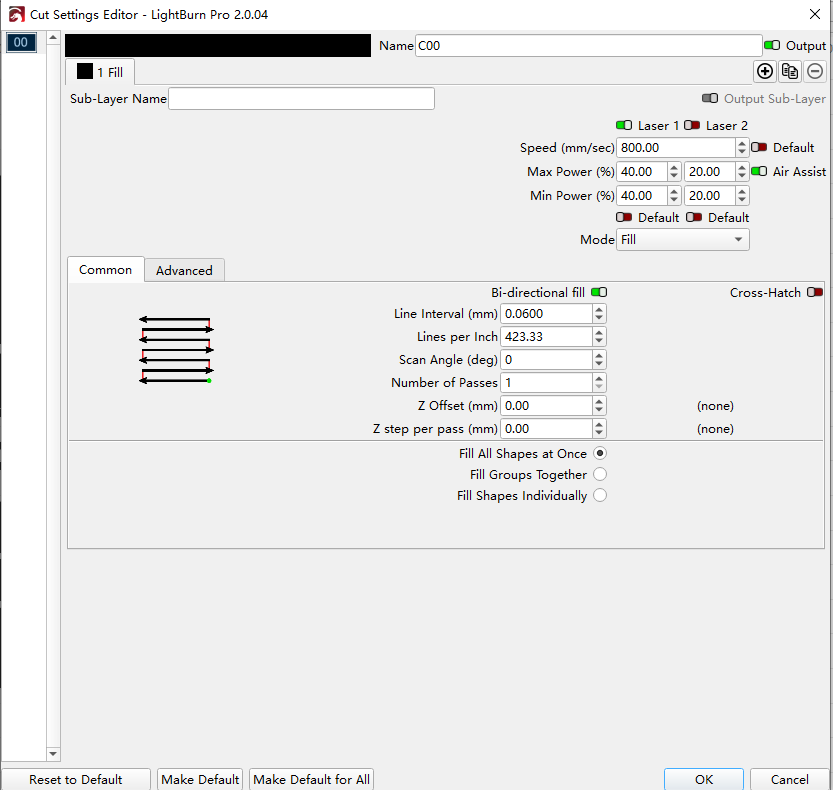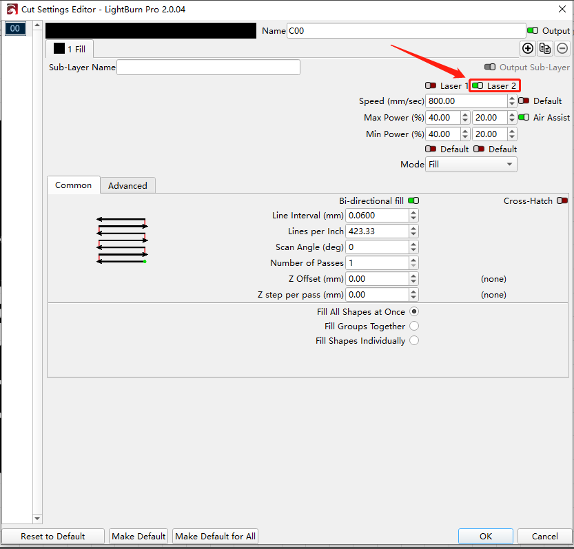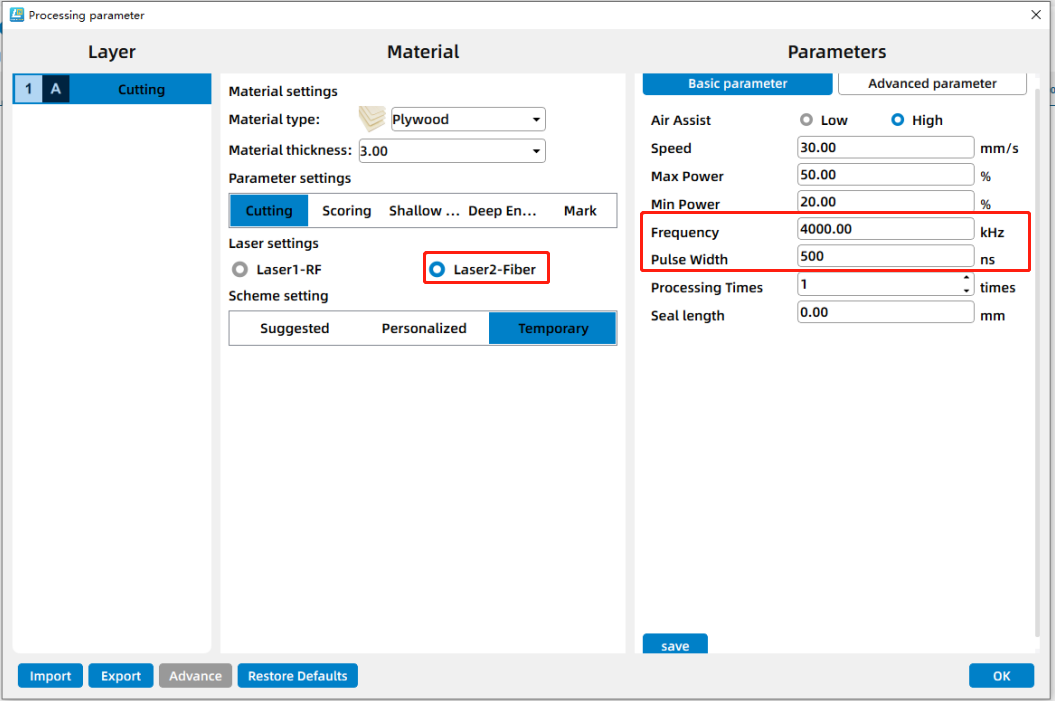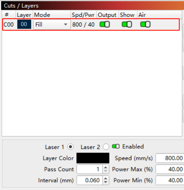 When Laser 2 is selected in a layer, the machine will automatically adjust the autofocus height and use the fiber laser for processing during operation.