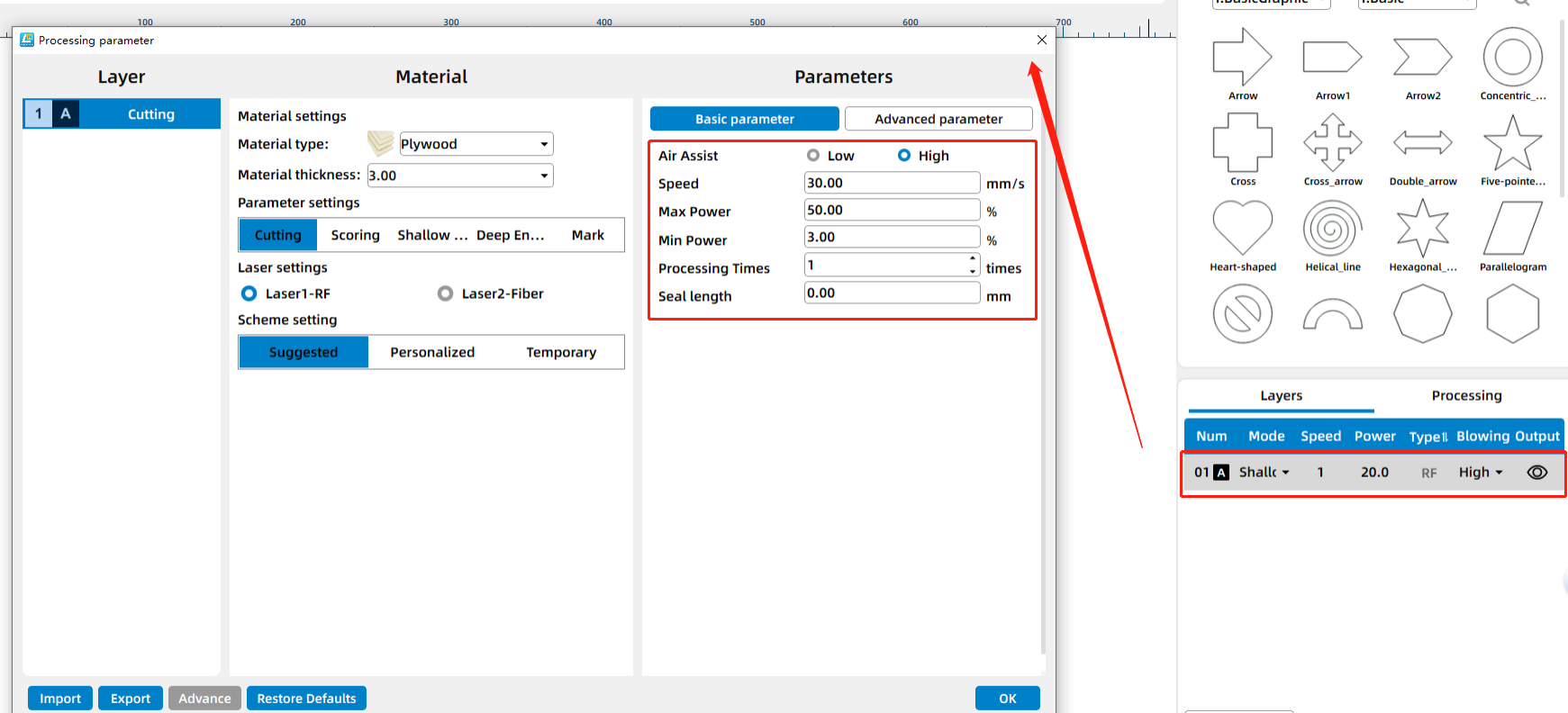 For more detailed software processing parameter settings and instructions, please refer to the LaserMaker manual: