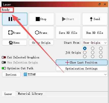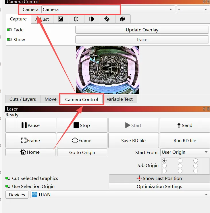 For TITAN51/63 machine models, you must connect each top cover camera's cable to the computer individually or simply use the left or right camera, because LightBurn software does not support dual cameras yet.
