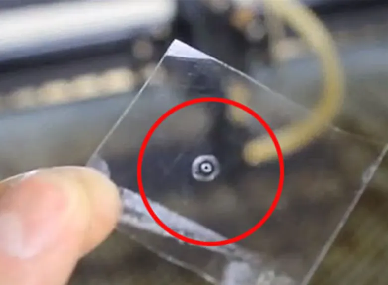 If this situation arises, place a transparent acrylic sheet to the air nozzle and perform a pulse test at 30% power to verify whether the beam is emitted vertically from the center of the laser head's base.