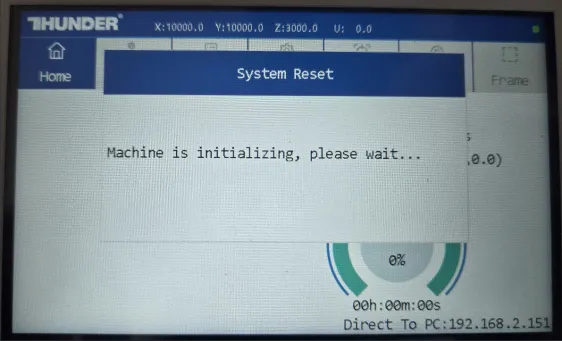 After clicking on the prompt to allow the laser head to the origin position, the following screen will remain displayed for approximately 60 seconds. After 60 seconds, the machine will initialize the remaining functions and allow you to use the screen.If your interface shows Chinese interface, you can refer to this article to change your language system.