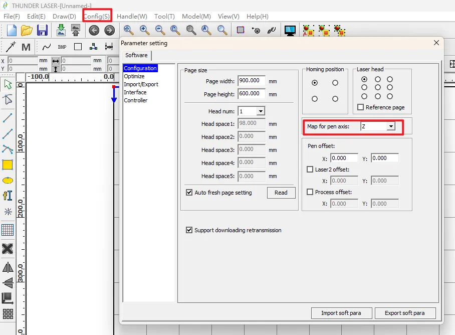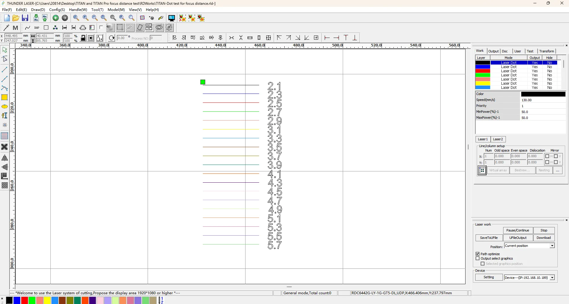 Titan has one focus-depth value for the RF tube. Titan Pro has two focus-depth values (RF and Fiber). RDWorks focus test files: Focus distance testing file-RDWorks