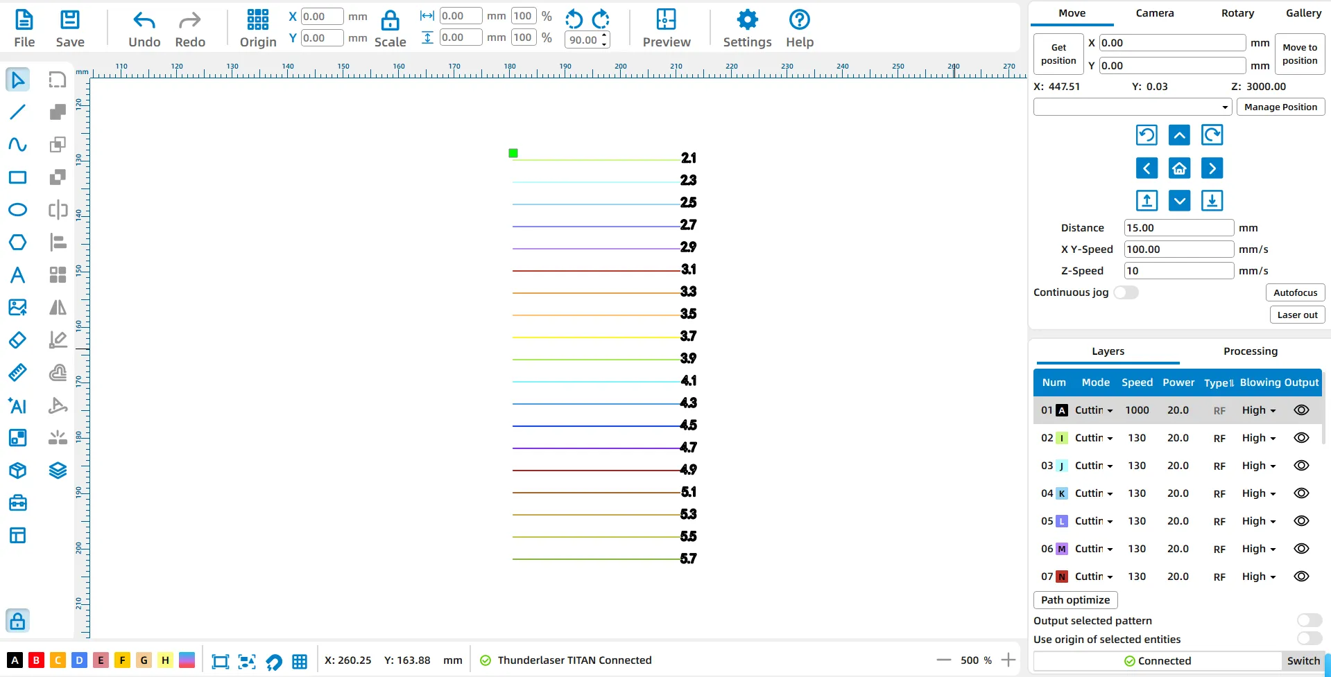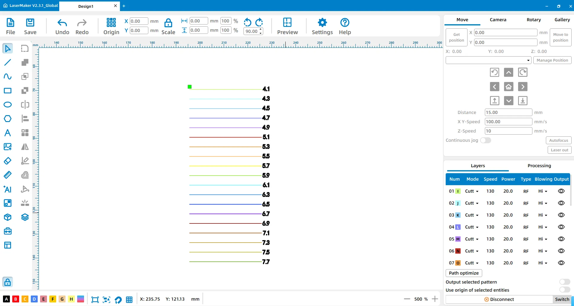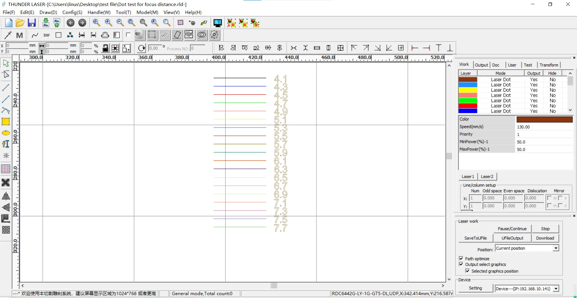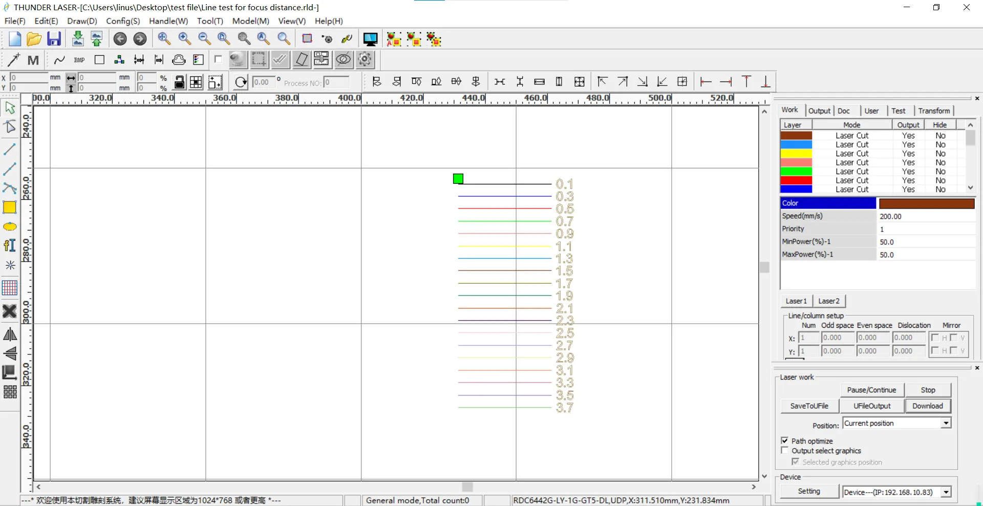 Connect to the machine in RDWorks and open the focus distance test file. Use the correct RDWorks file for your model: