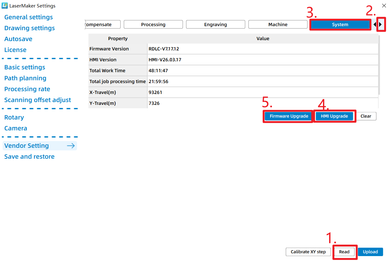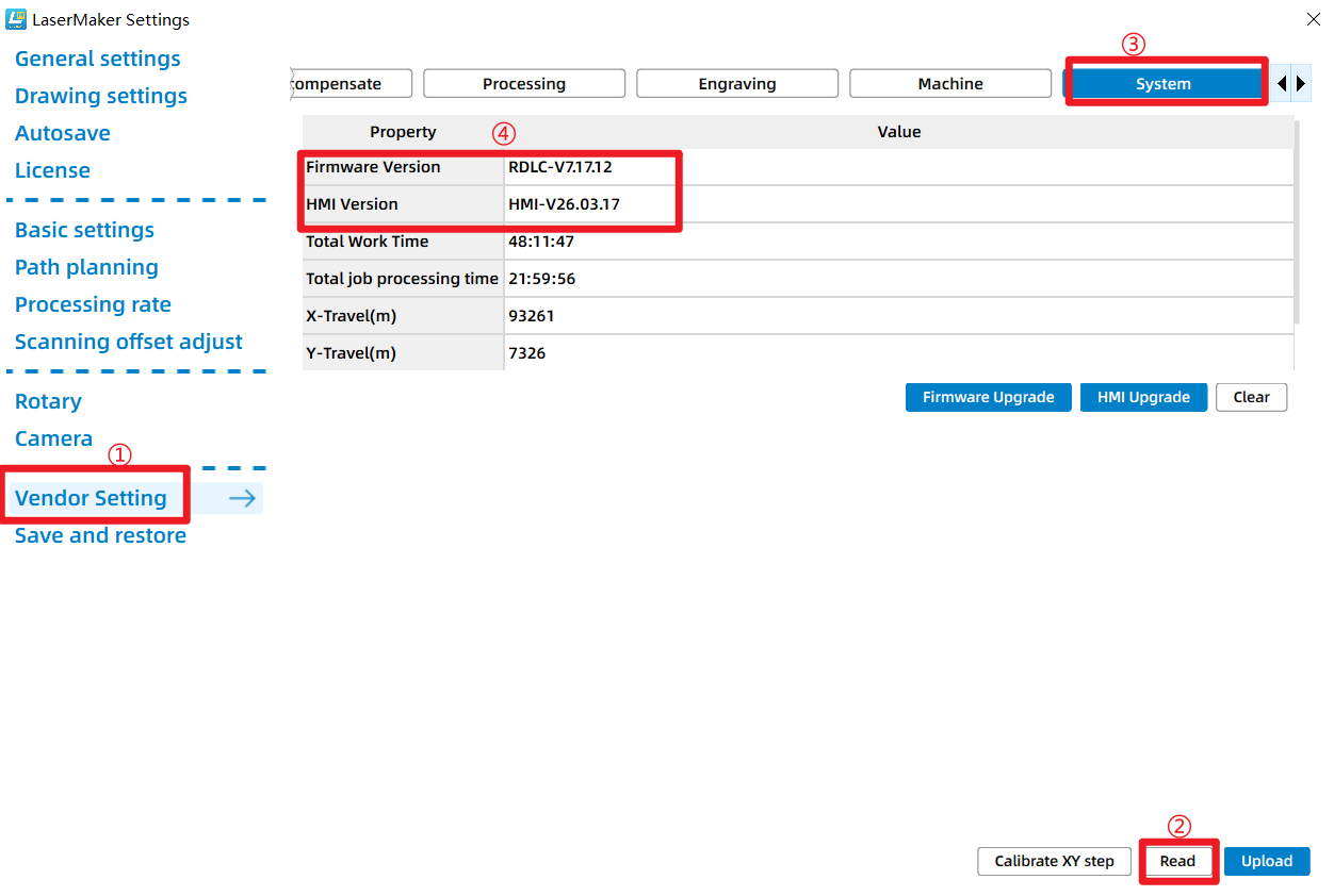 In the Laser Maker software, you may need to re-enter the Vendor Setting interface and click "Read" to refresh and display the correct firmware version; otherwise, it will still show the version before the upgrade.