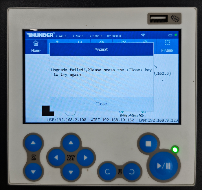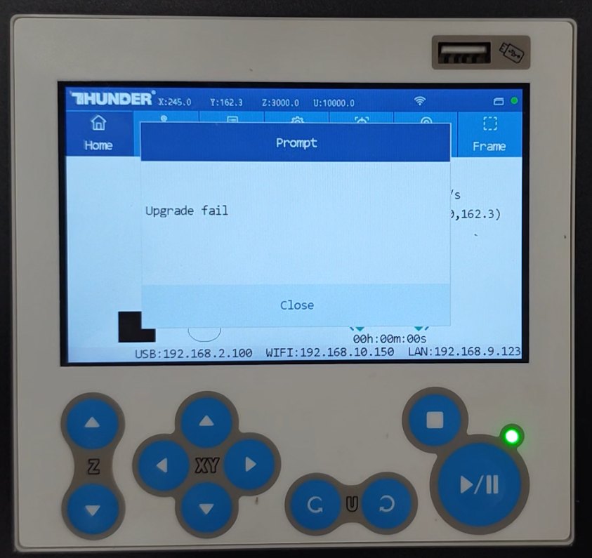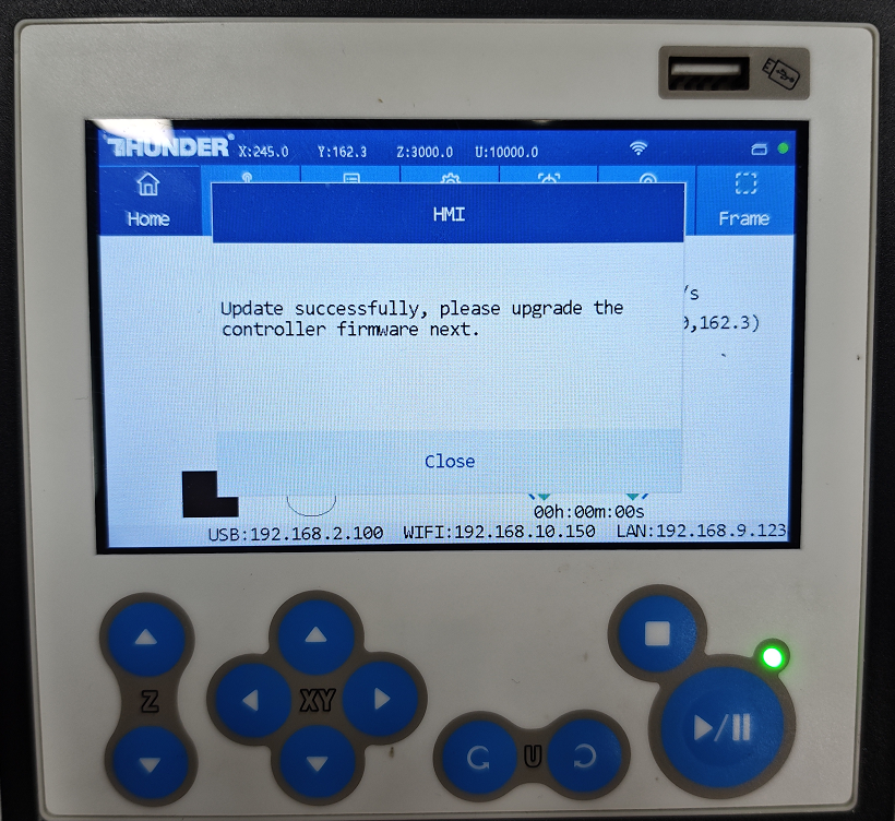 If it fails, it will display "Upgrade failed! Please press the <Close> key to try again." In this case, you need to click "HMI Upgrade" again in the Laser Maker software to retry the HMI upgrade.