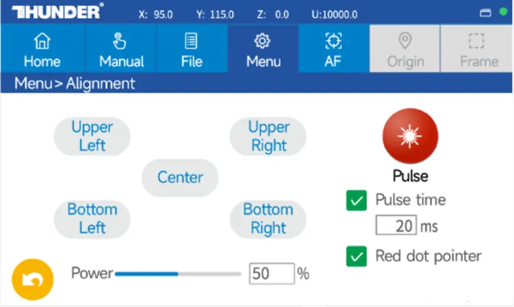 4.Turn off Pulse time and Red dot pointer>>Set 20% Power>> Move to each corner>>Click Pulse button and check the beam path.