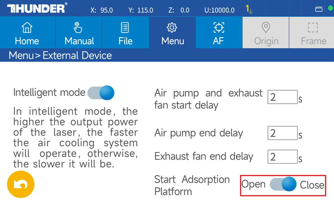 - First, locate the 'vacuum adsorption platform' function option on the touch panel and turn it on.