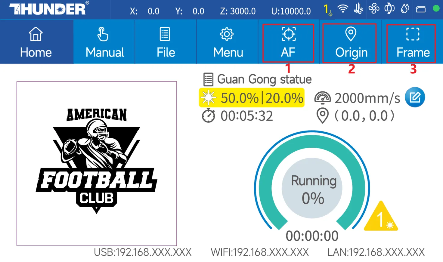- After placing the material, click 'AF' to perform autofocus, then click 'Origin' to set the origin, confirm that there is no collision risk with 'Frame' , close the lid cover, and click 'Start-Pause' to start processing.