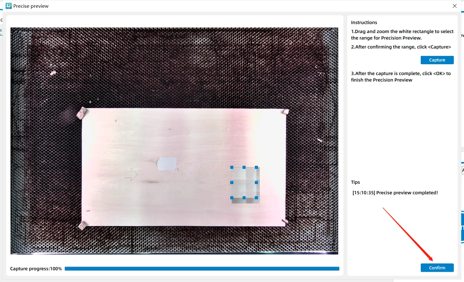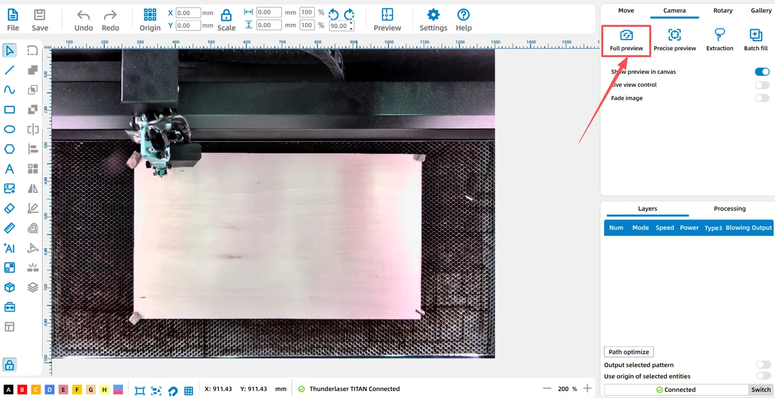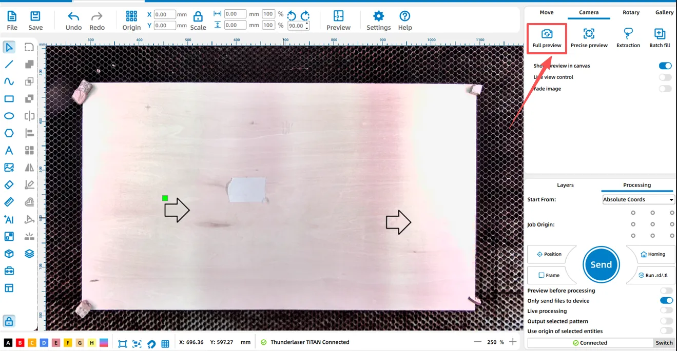 In practical laser processing operations, if the full-frame preview accuracy of the equipment's top cover camera fails to meet precise positioning requirements, LaserMaker's "Precise Preview" feature provides a targeted optimization solution.