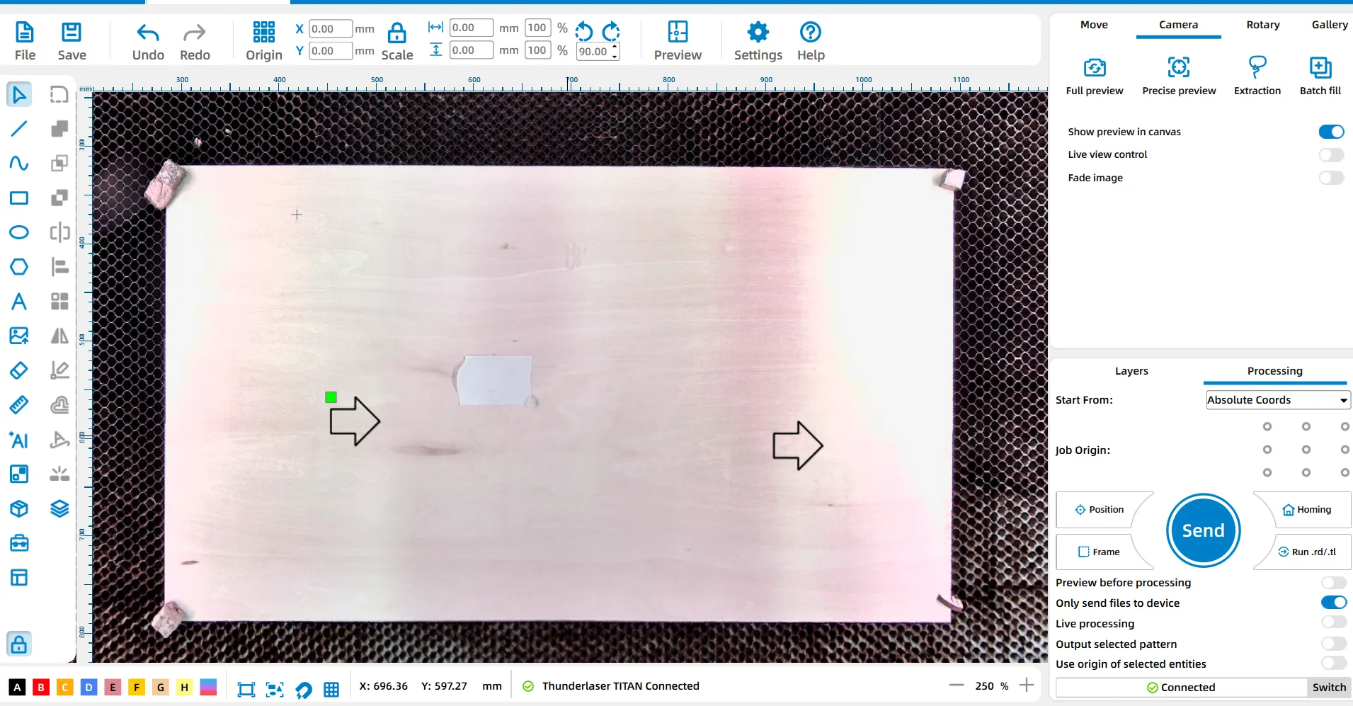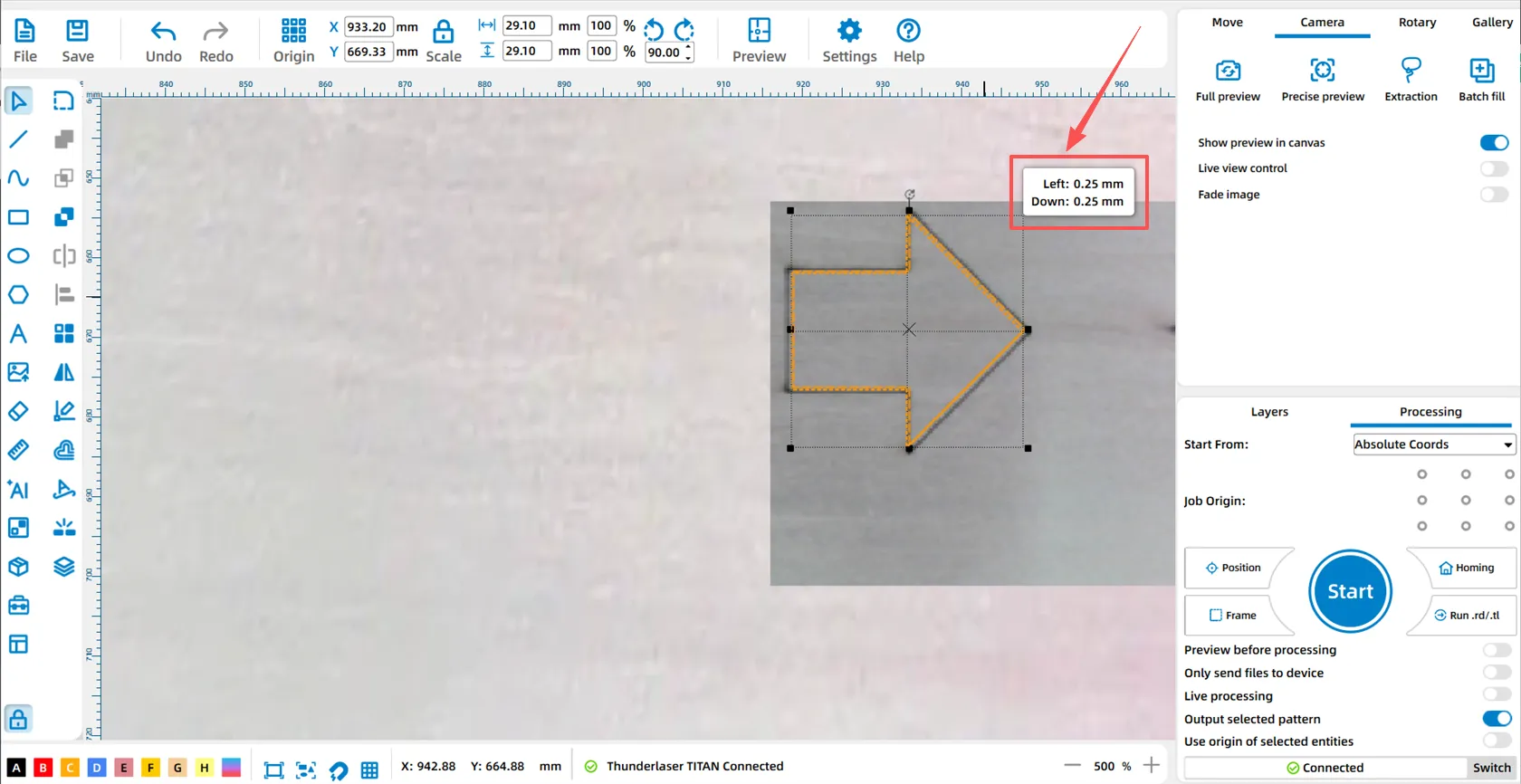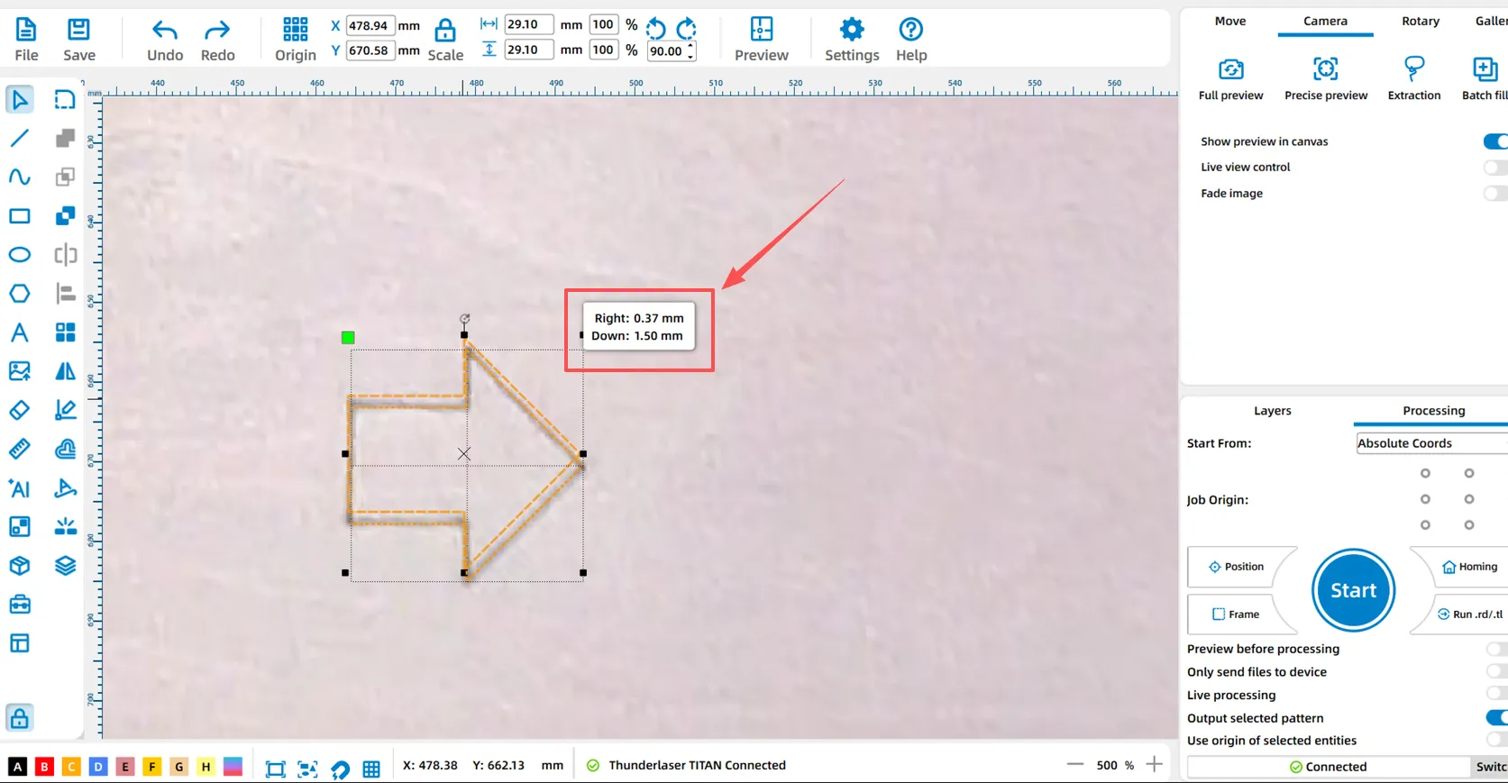 After updating the canvas, we can observe that both left and right arrows exhibit deviations between the canvas and the actual processing position, based on the accuracy of the (overhead) top camera, which is currently ±2mm and in the process of being improved.