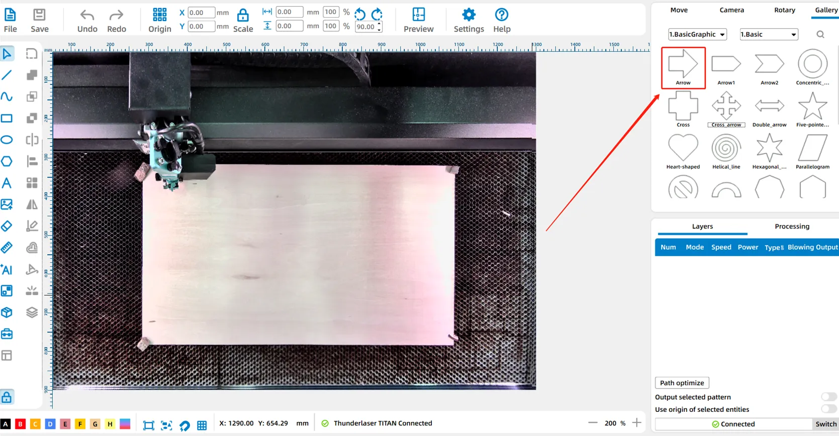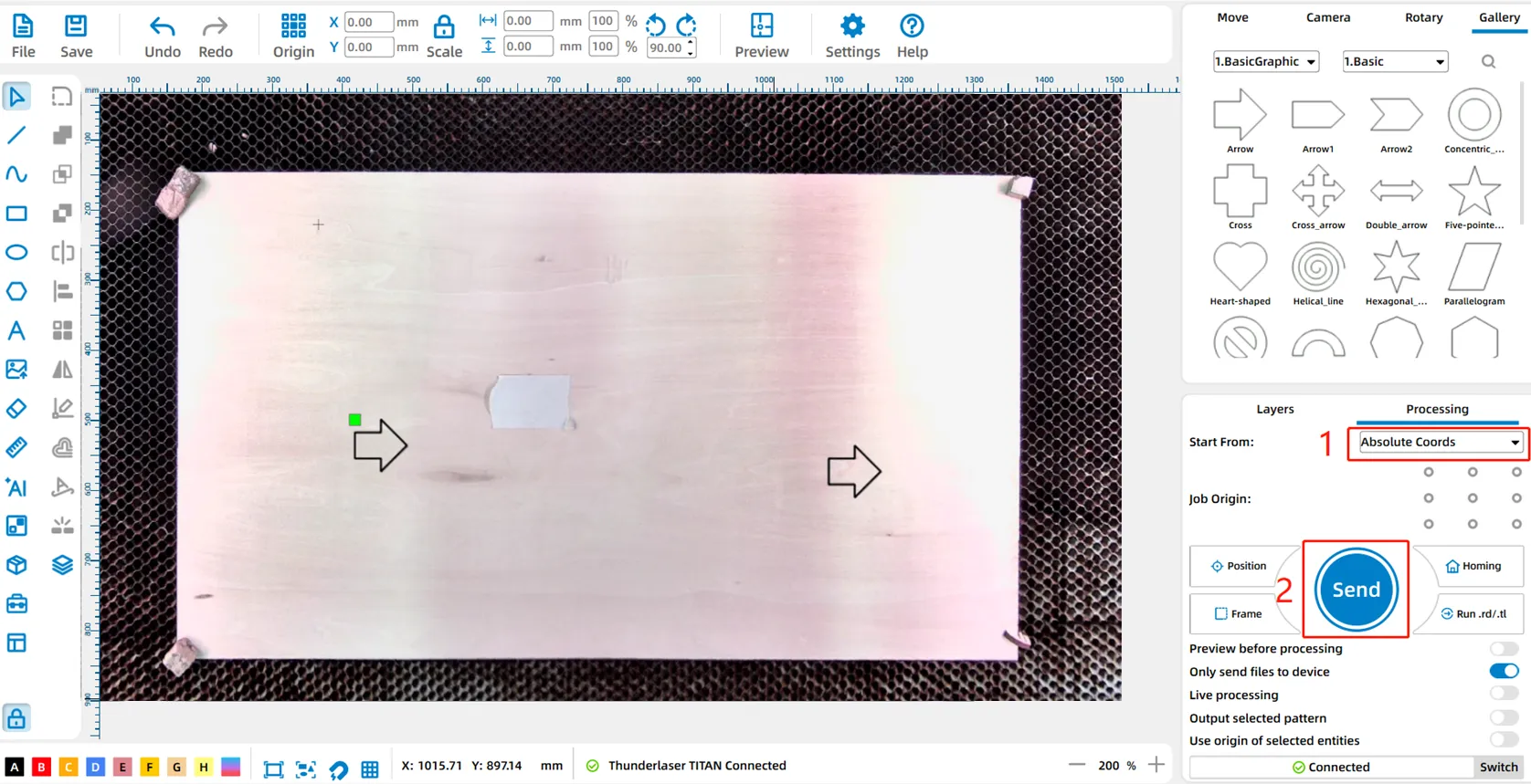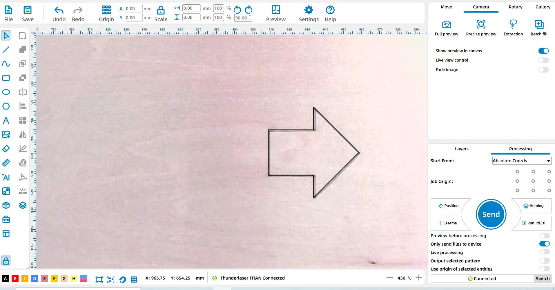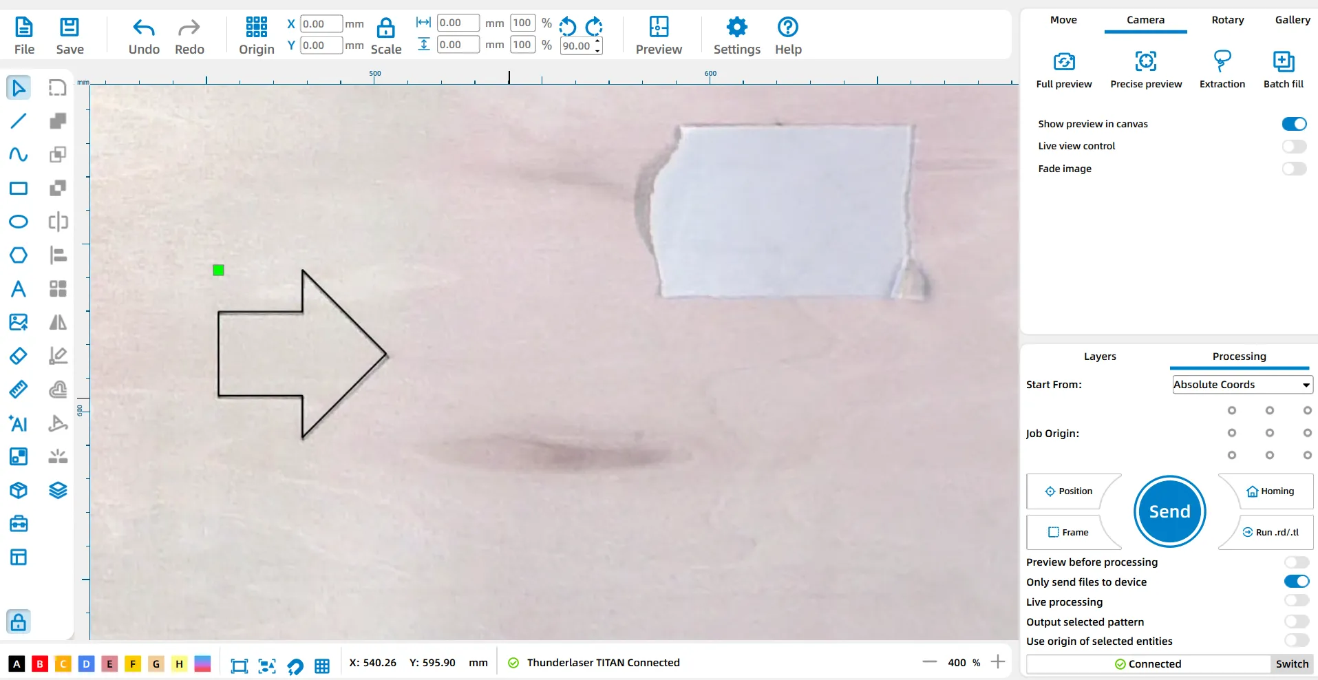 After updating the canvas, we can observe that both left and right arrows exhibit deviations between the canvas and the actual processing position, based on the accuracy of the (overhead) top camera, which is currently ±2mm and in the process of being improved.