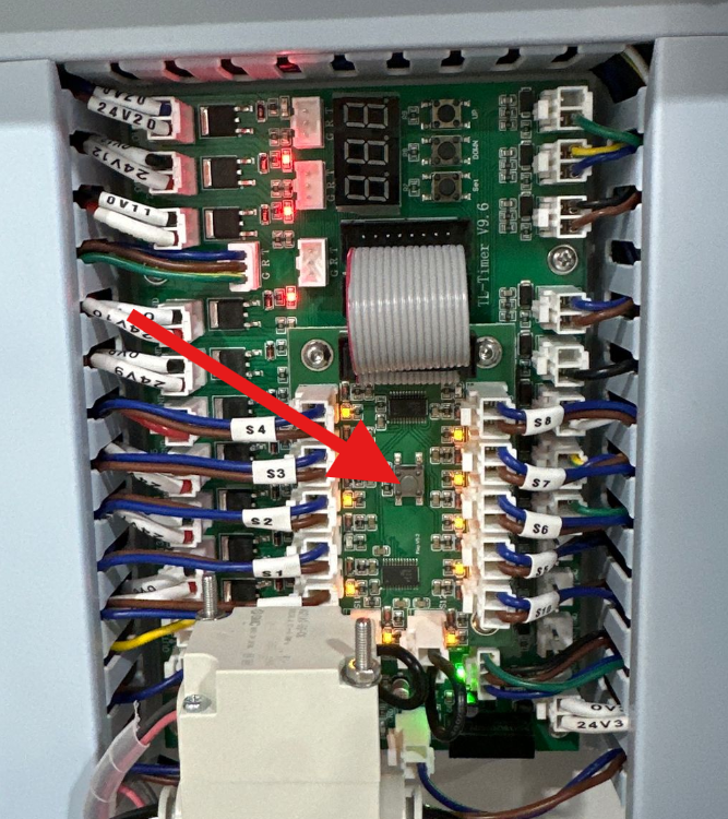 To bypass the doors, locate the Door board that is integrated to the TL timer and press the button shown