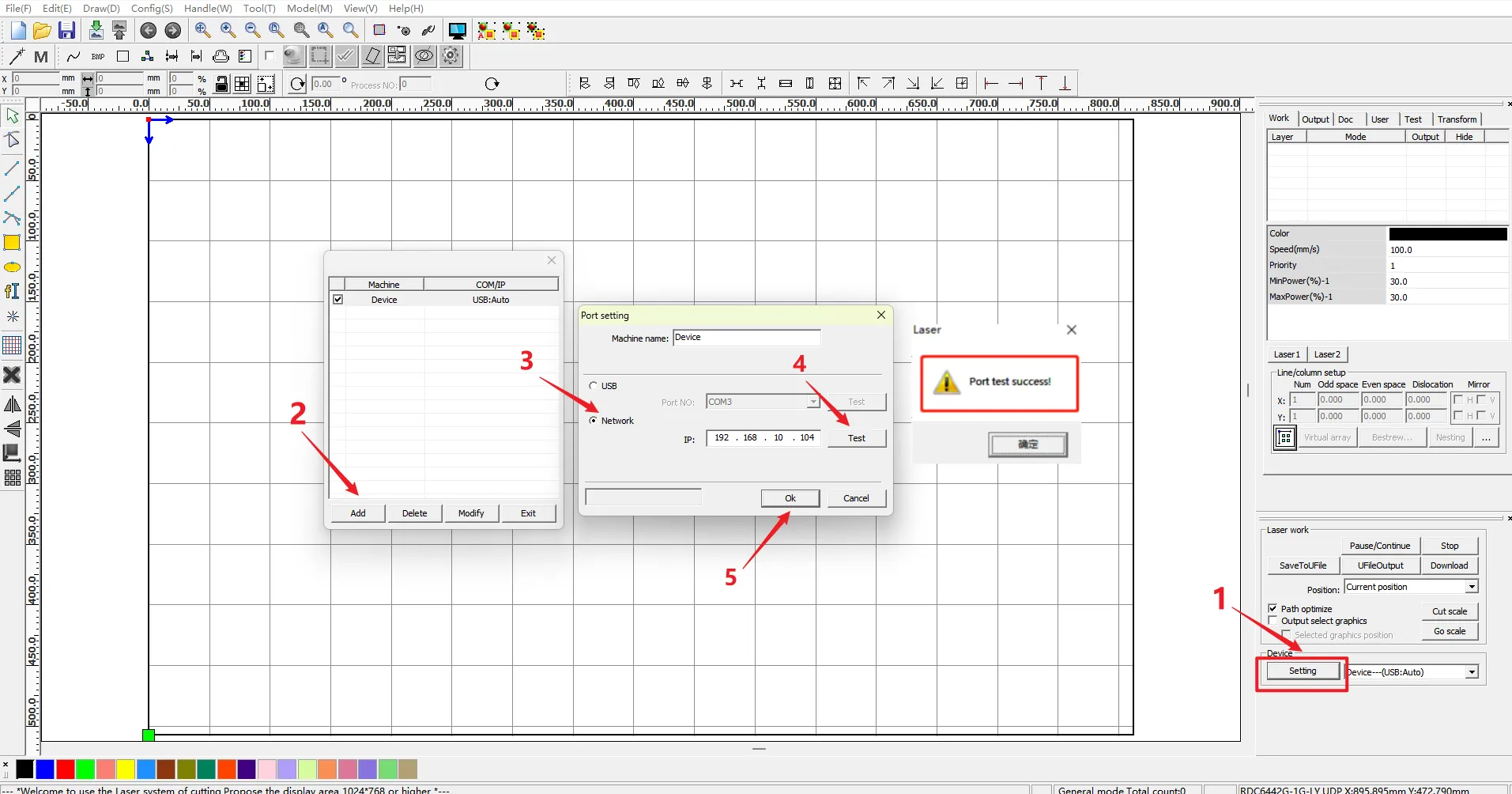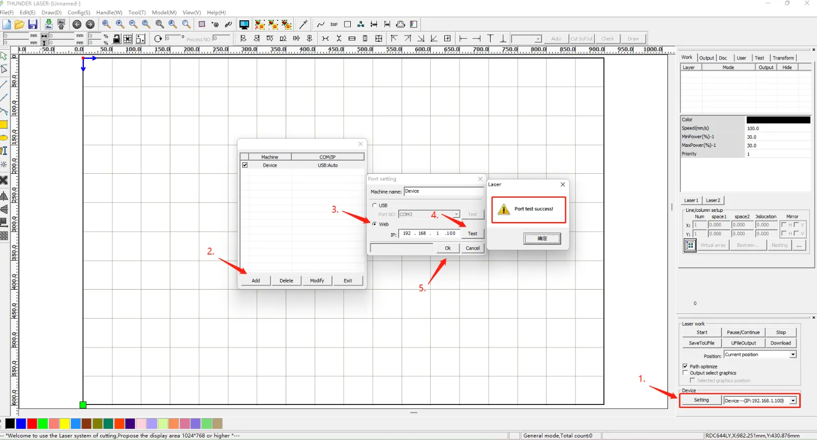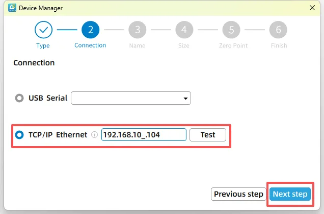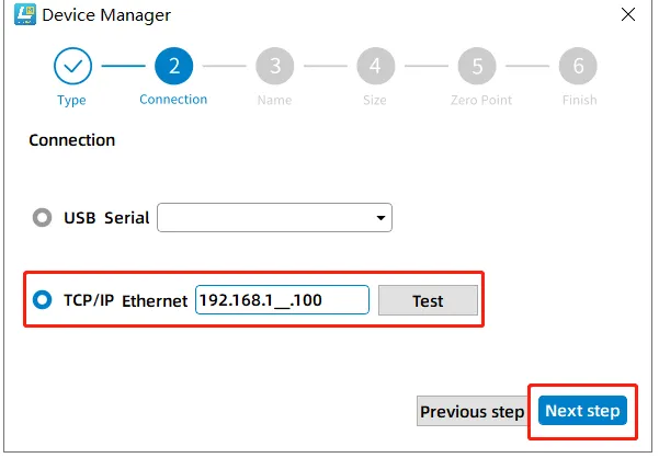 Step 3: Select the device brand and device series. | Step 4: Enter the TCP/IP address of the device, and click "Test" to check whether the IP address exists. |