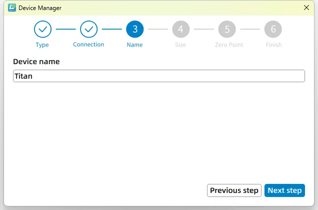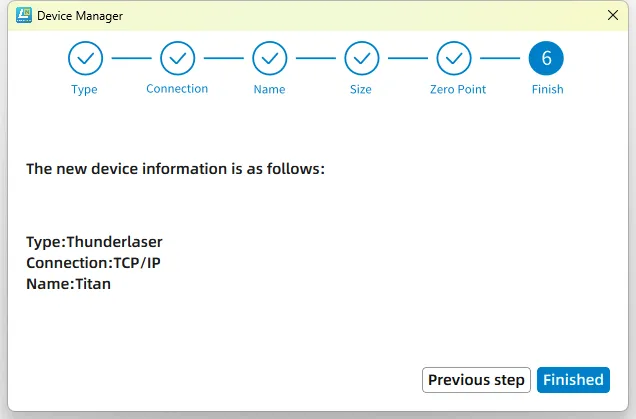 Step 5: Enter the device name. | Step 6: Click "Finished" to complete the creation of the device. |