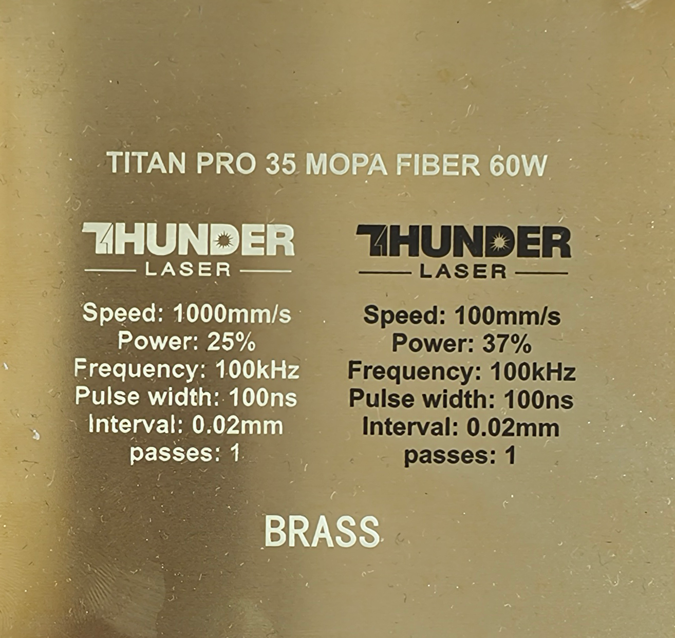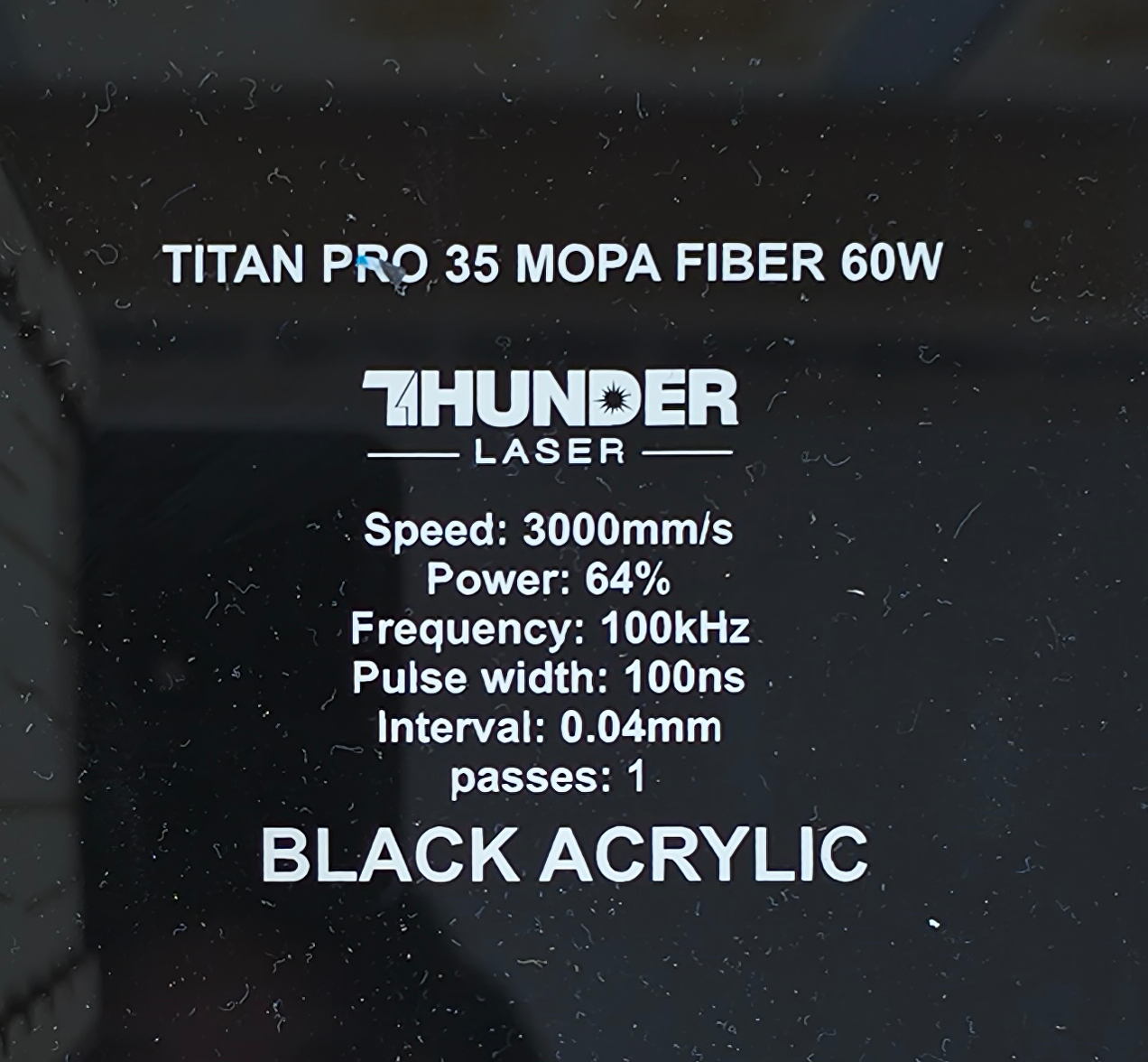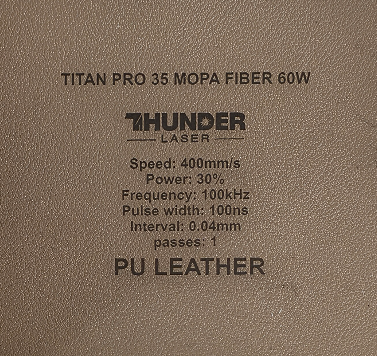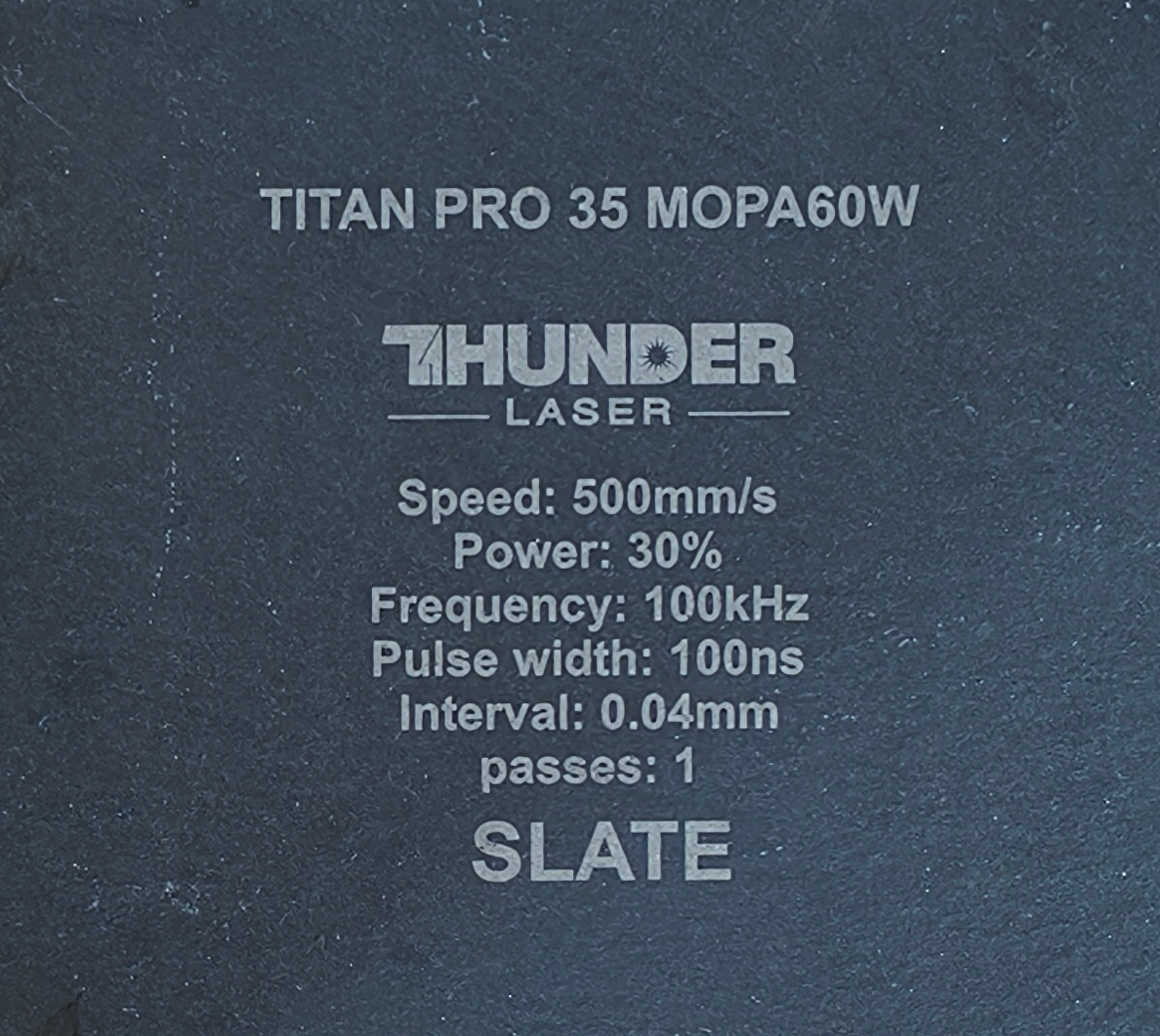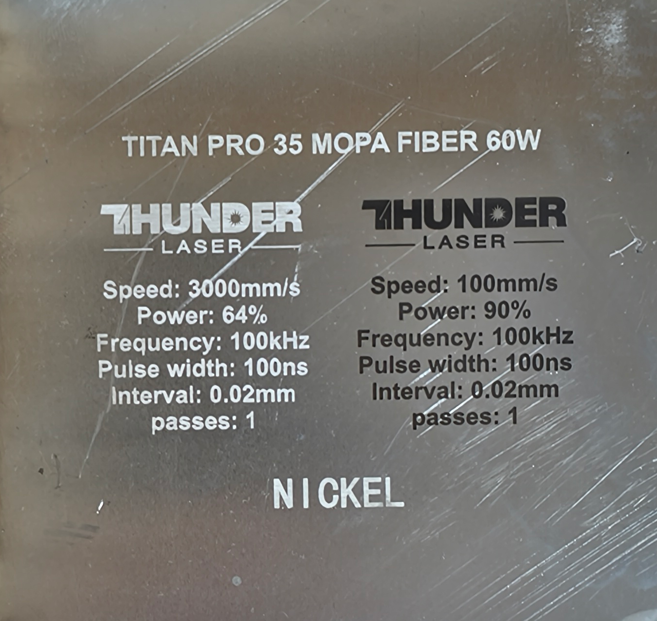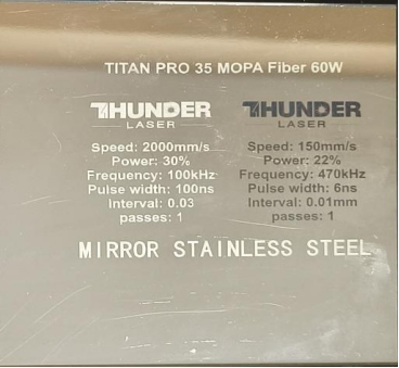 Material | Effect | Speed (mm/s) | Power (%) | Frequency (KHz) | Pulse Width (ns) | Hatch Type | Interval (mm) | Passes | Pic |