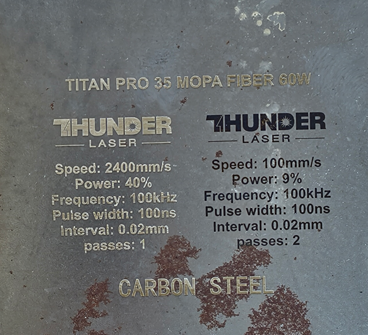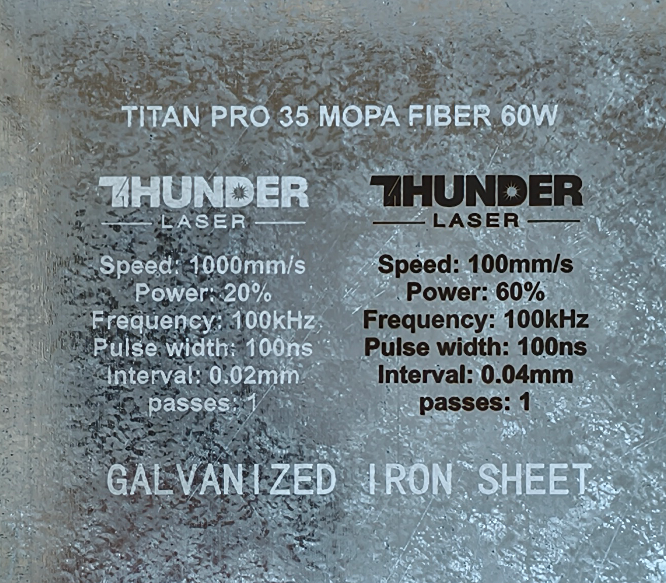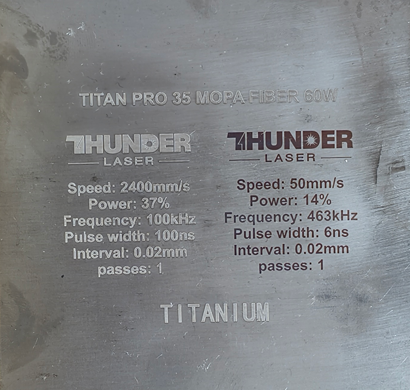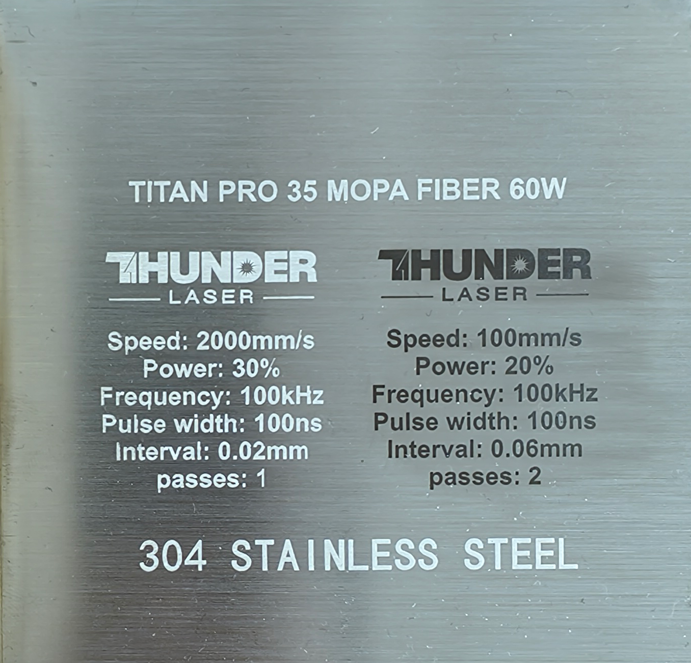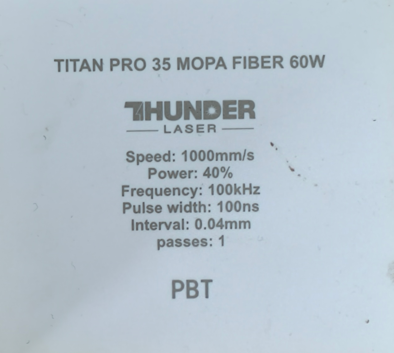 Material | Effect | Speed (mm/s) | Power (%) | Frequency (KHz) | Pulse Width (ns) | Hatch Type | Interval (mm) | Passes | Pic |