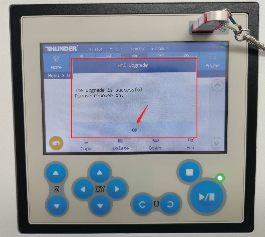 The HMI firmware must be updated before the controller firmware can be updated. And please don't turn off the machine during the firmware update process.HMI Firmware Upgrade: