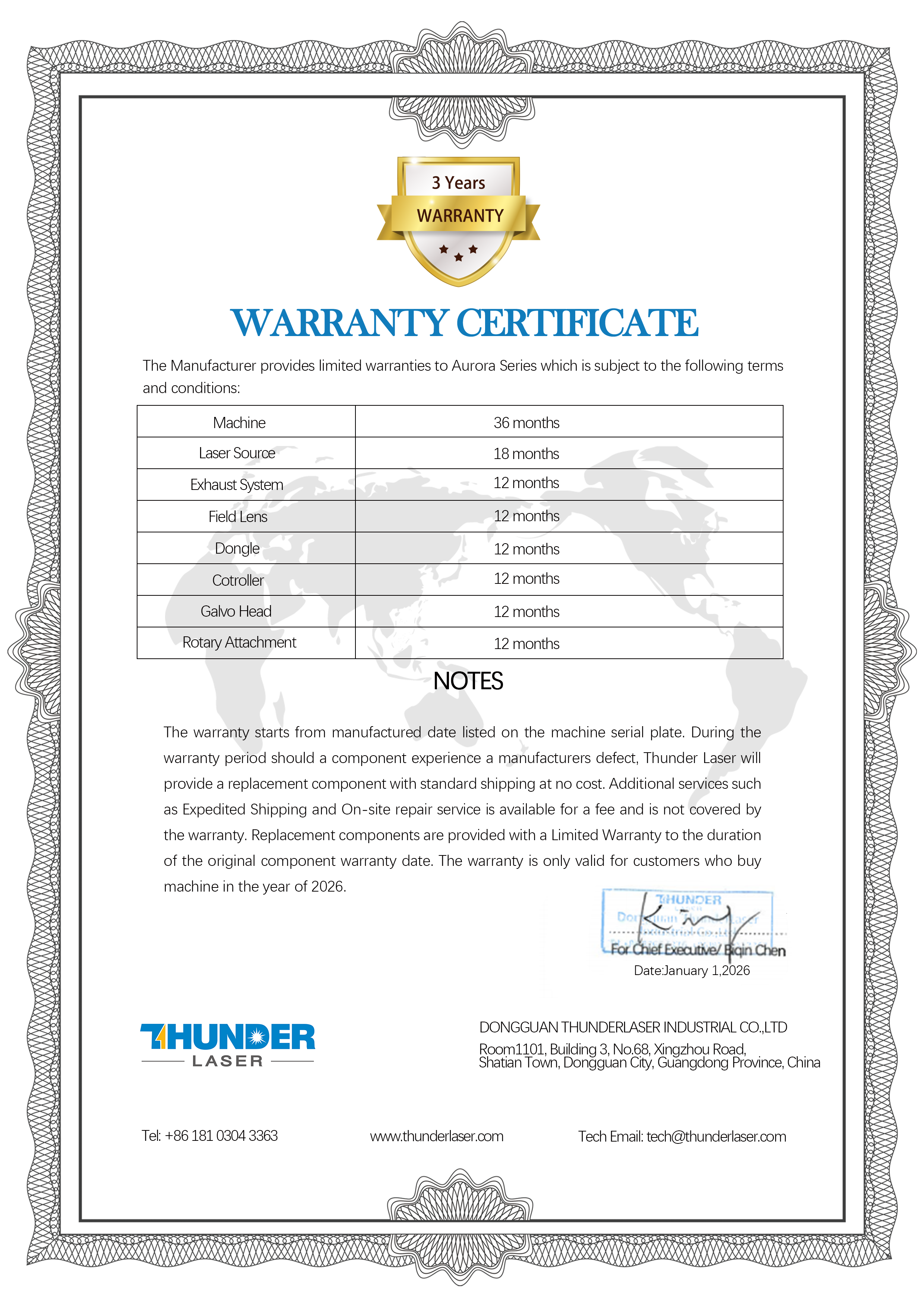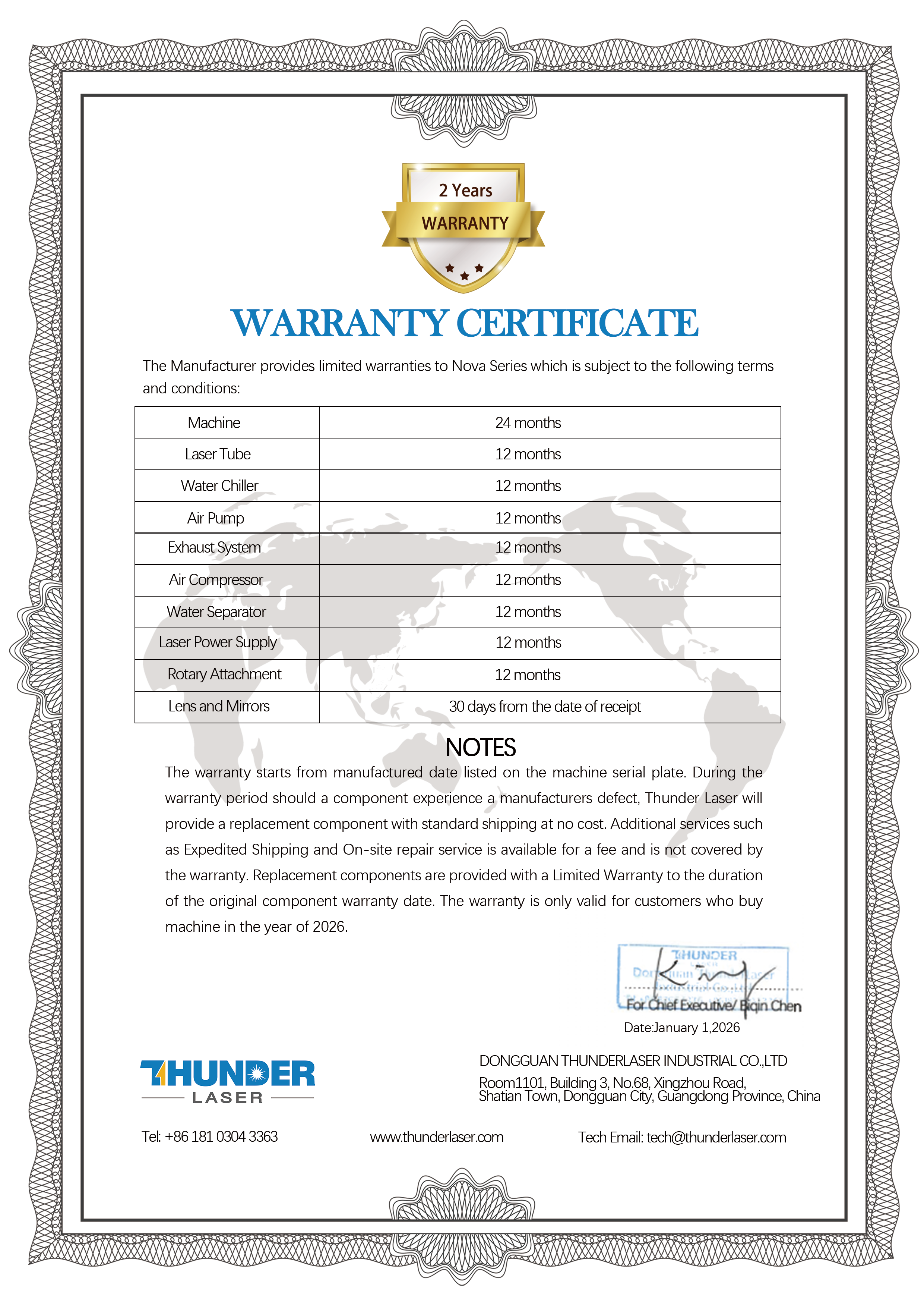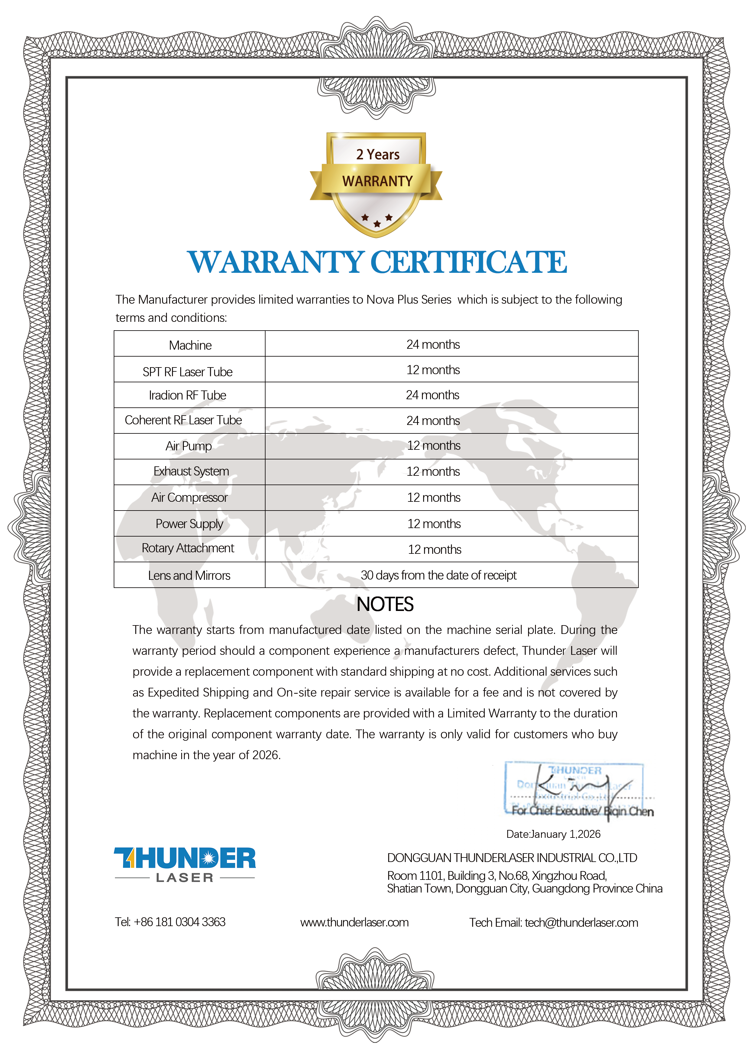 Warranty Certificate--Nova, Nova Plus, Titan, AURORA,Thunder Bolt Series